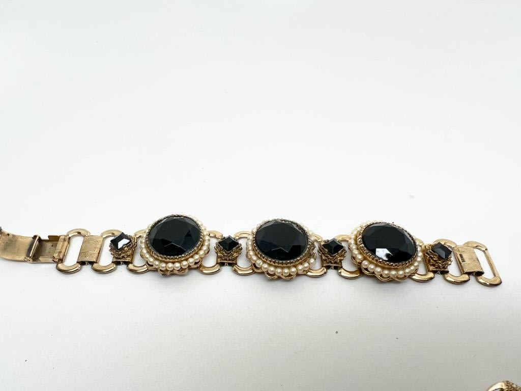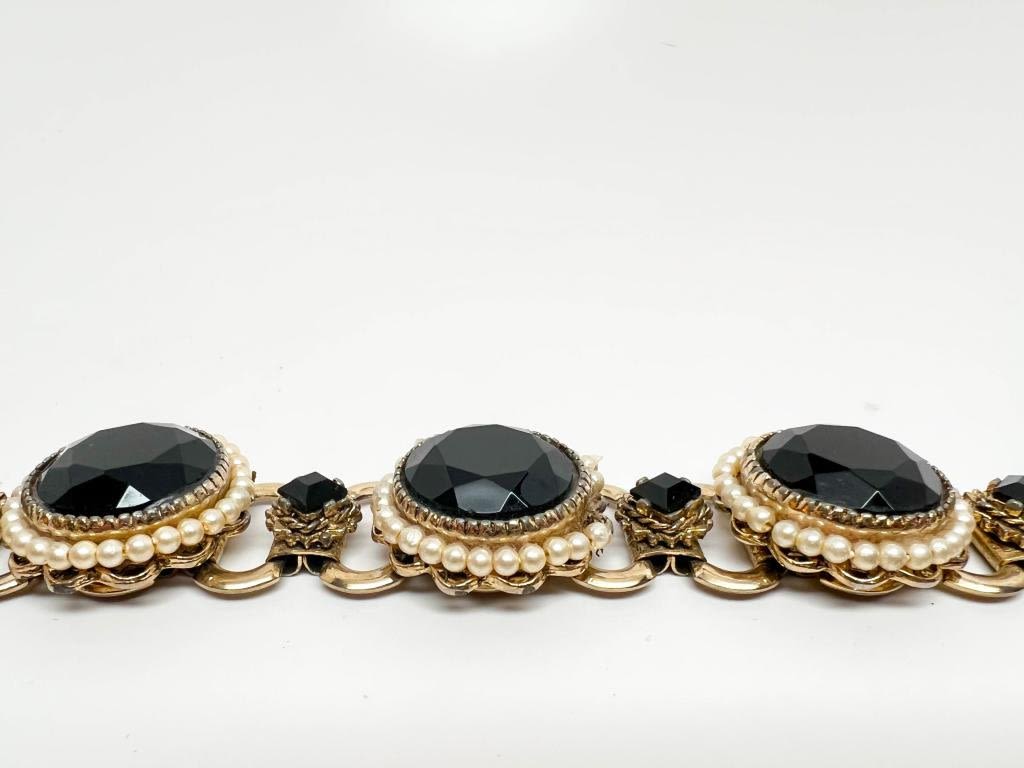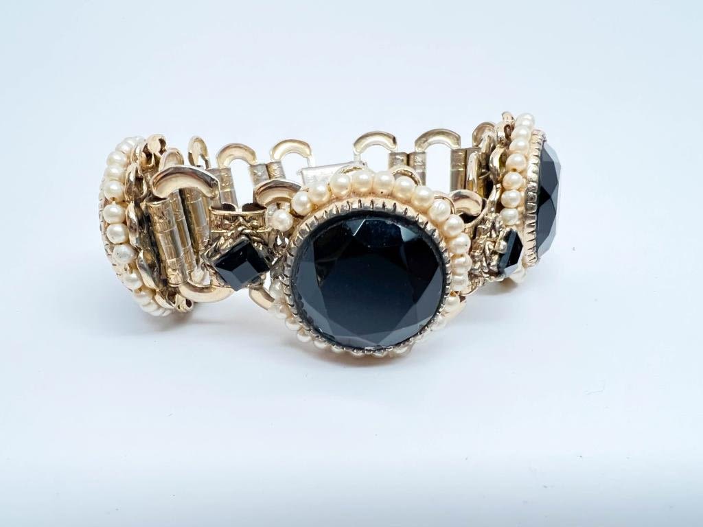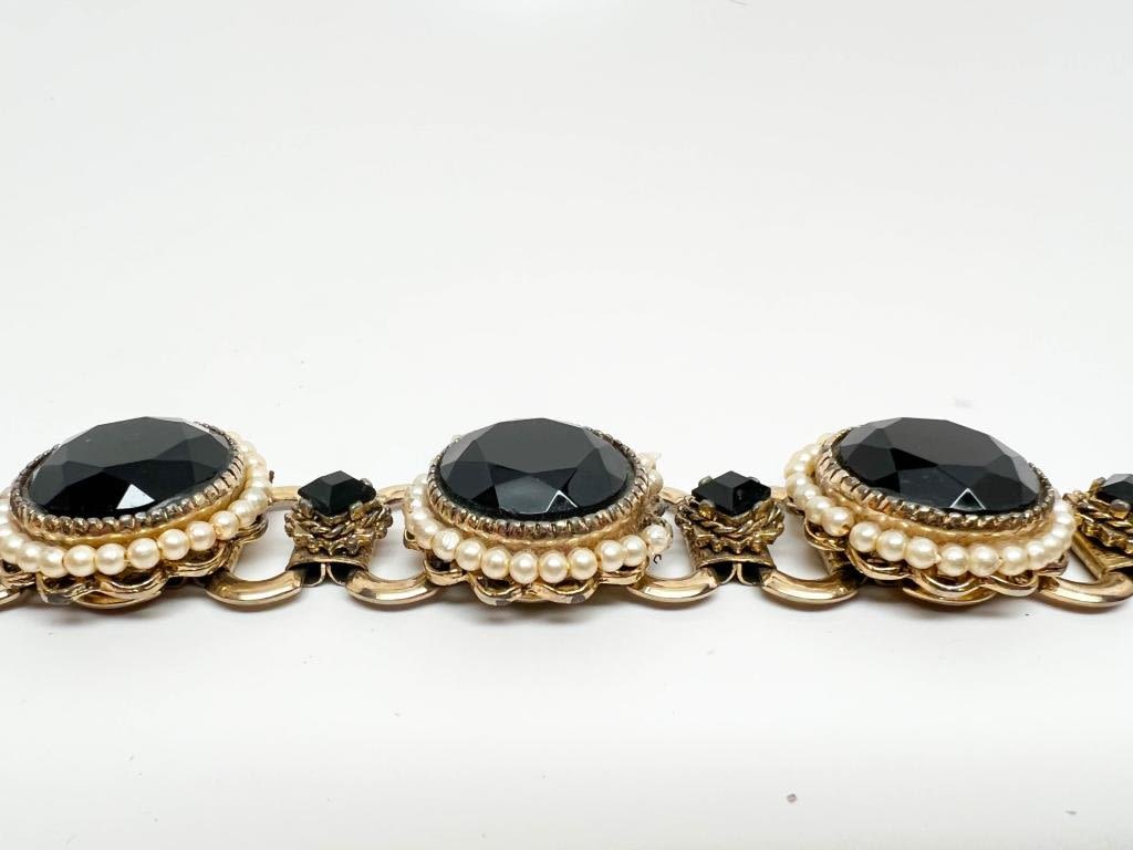 VINTAGE OS FACETED STONE ORNATE BRACELET, HEAVY PIECE, WHITES, BLACKS, SILVERS TONES