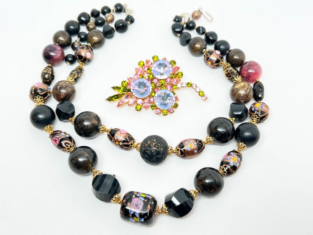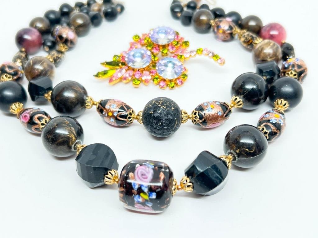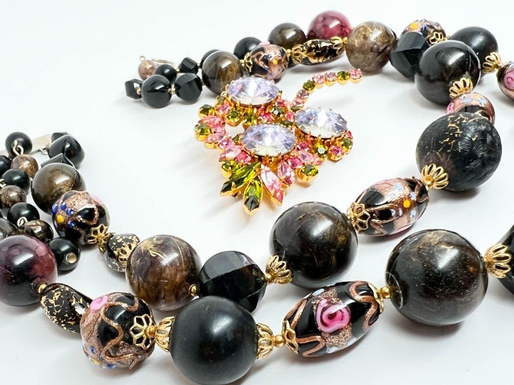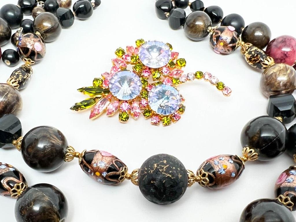 COLORFUL PASTEL ON BLACK NECKLACE AND BEAUTIFUL PASTEL RHINESTONES BROOCH , BOTH ARE LOVELY !!!