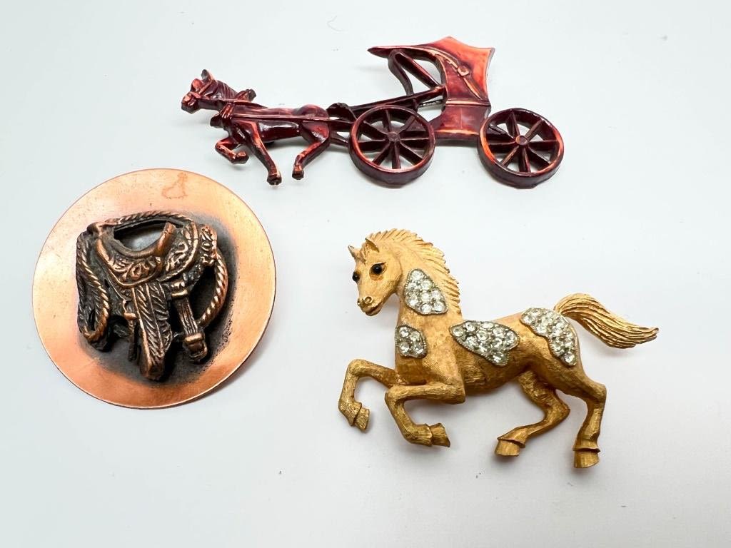 COPPER SADDLE, HORSES , HORSE AND BUGGY BROOCHES