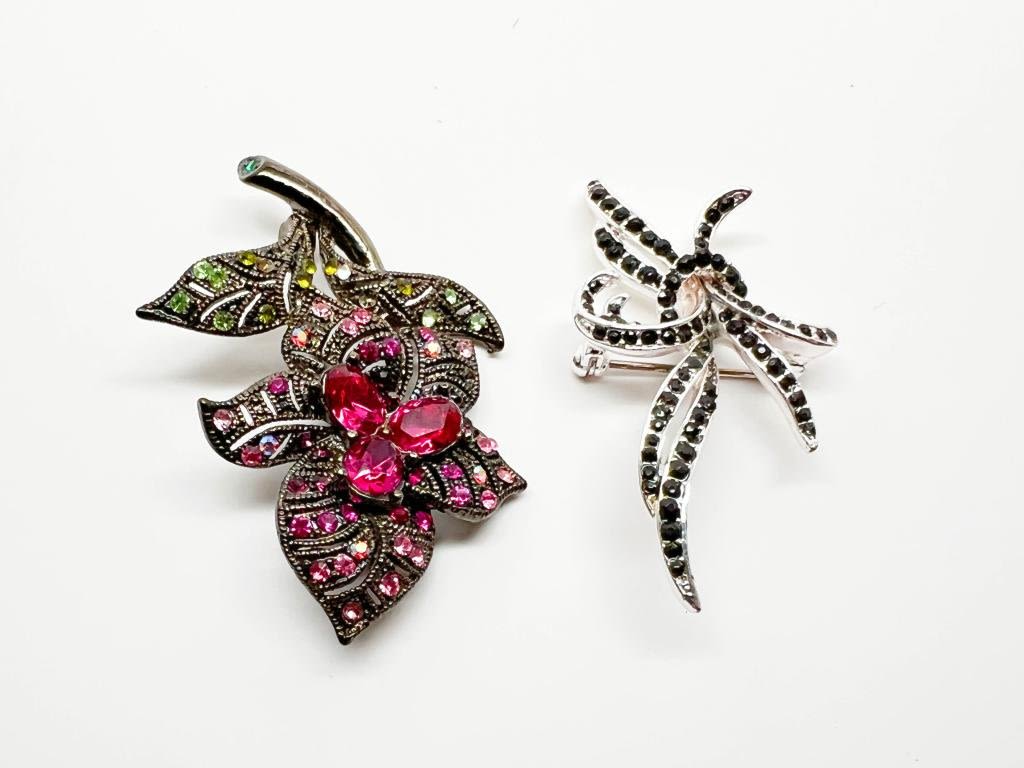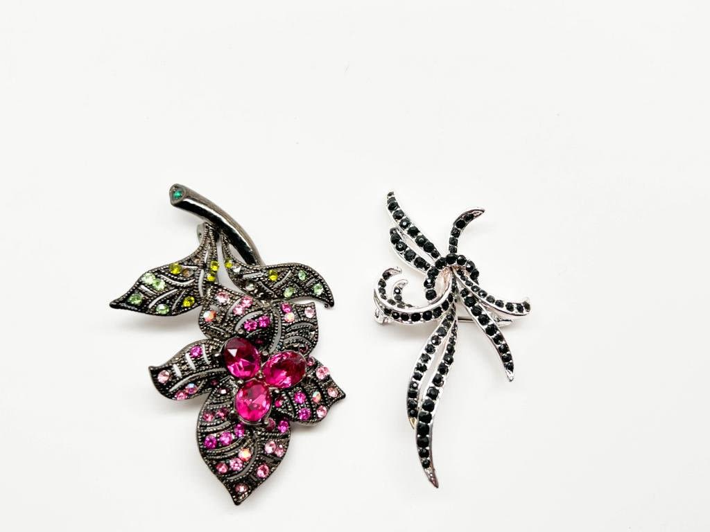 2 INTRICATE ELEGANT BROOCHES, MULTI COLOR STONES ON DARK , ELEGANT BLACK
