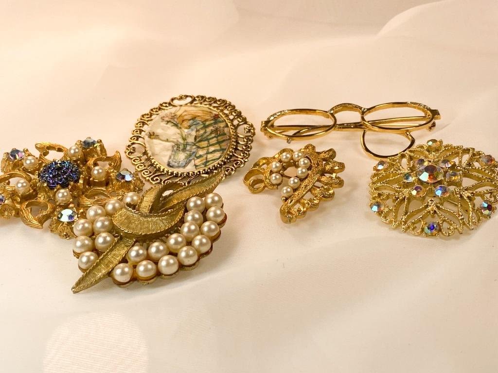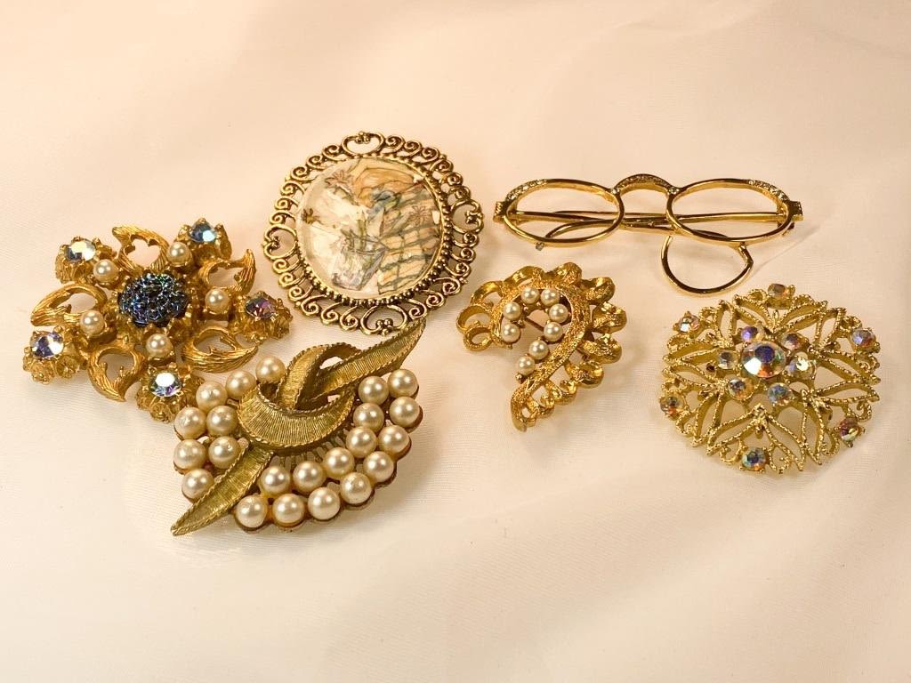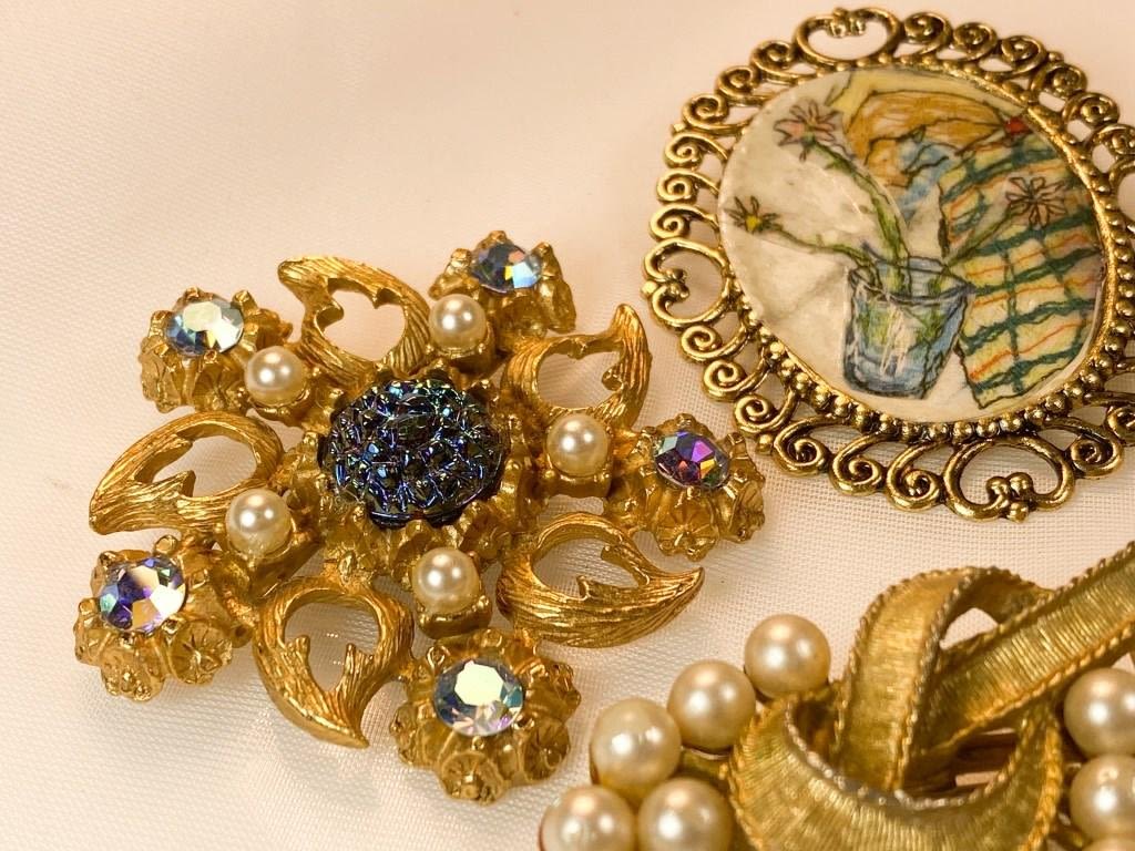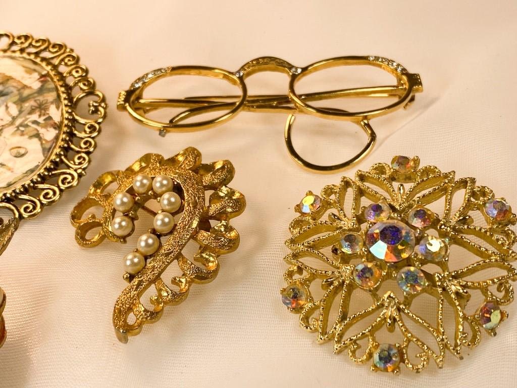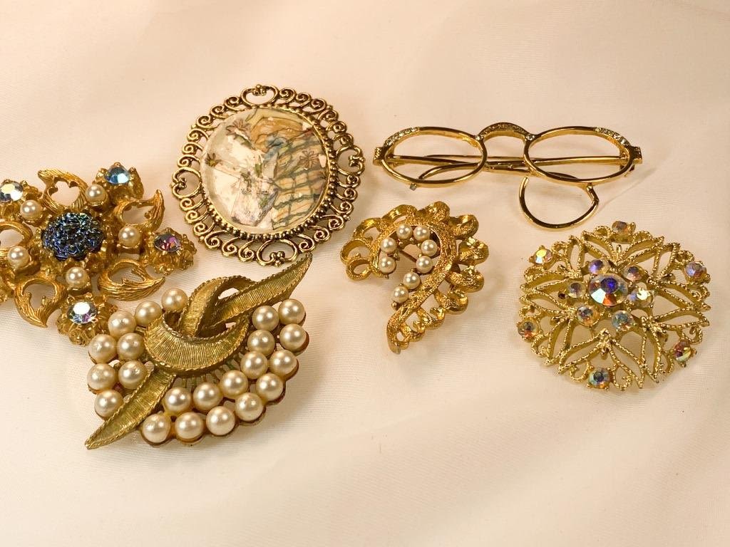 Vintage Brooches Lot, Delicate pearls, stonees and scrollwork