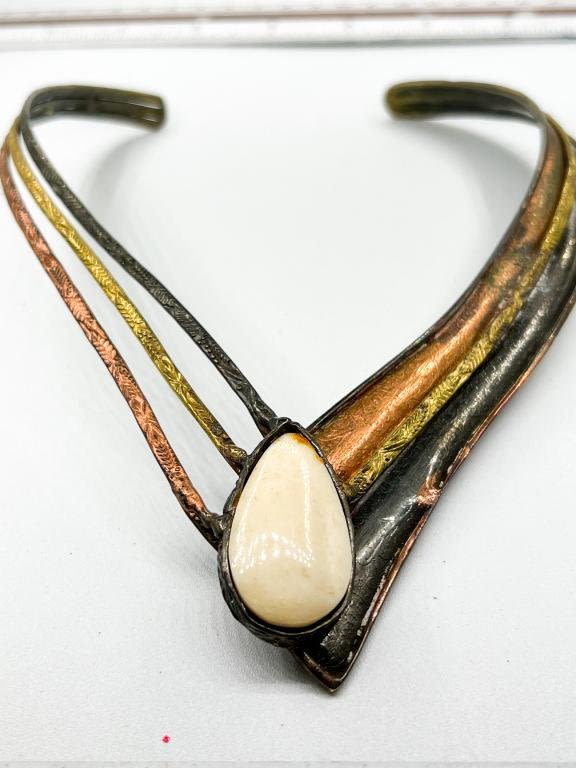 VINTAGE LARGE NECKLACE WITH STONE , HAS WEAR, VERY ARTISTIC COOL