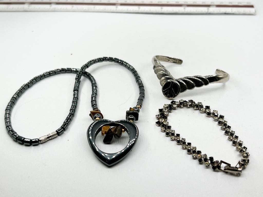 2 BRACELETS, ONE NECKLACE IN BLACKS, ONE BLACK AND WHITE RHINESTONES