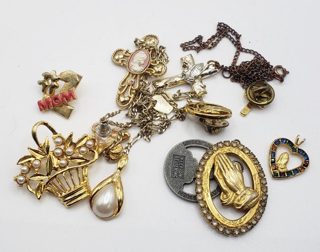 PMI VINTAGE GOLD TONE CROSS W CAMEO NECKLACE & RELIGIOUS LOT