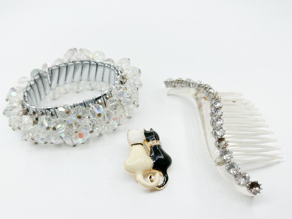 CATS BROOCH , CRYSTAL BRAC , & RHINESTONE HAIR CLIP