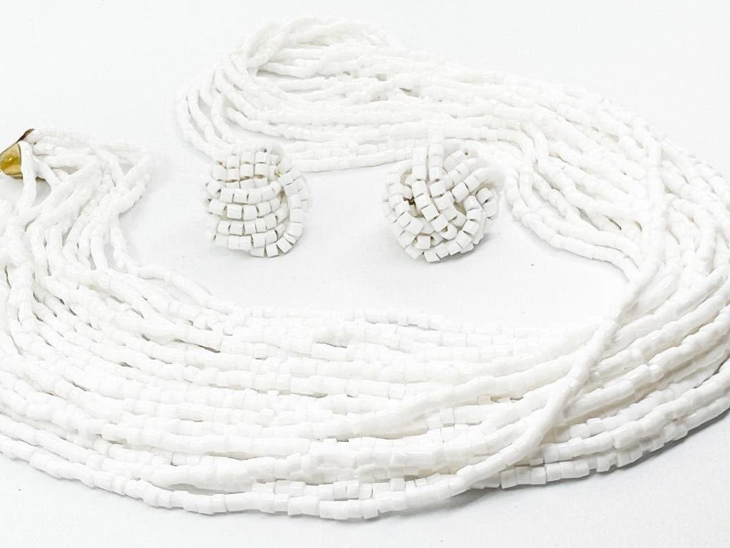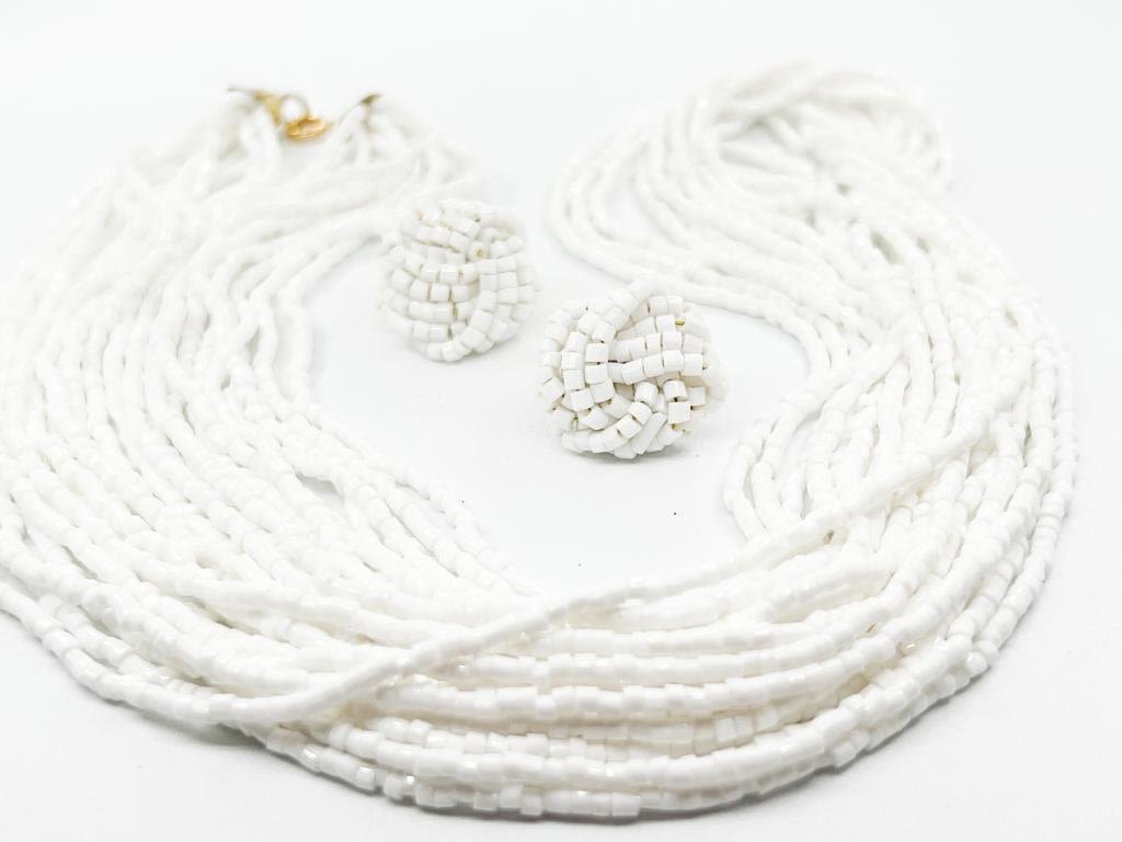 MULTI STRAND WHITE BEADED SET , NECKLACE AND EARRINGS , NICE 17-