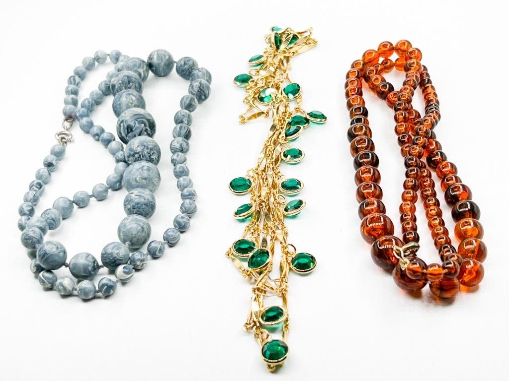 3 NECKLACE LOT, BLUE, GREEN, AMBER TONES