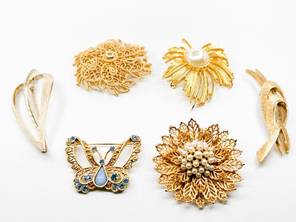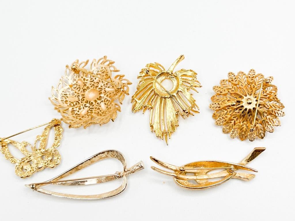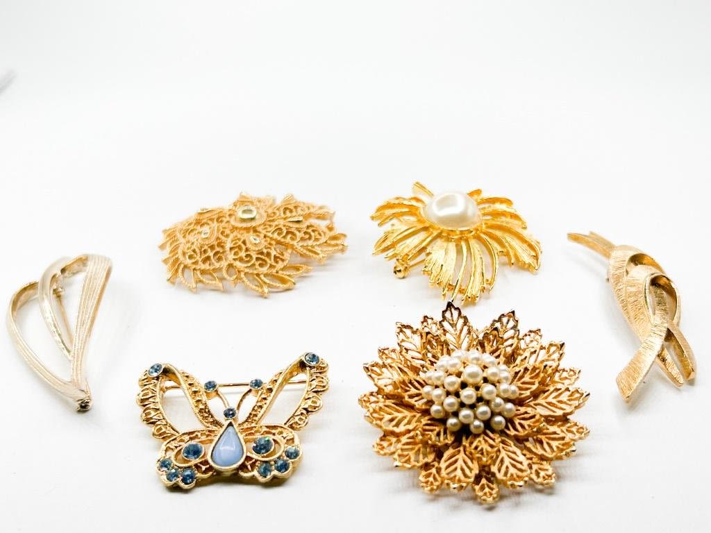 LUXURIOUS TRIFARI, SARAH, MONET +BROOCH COLLECTION BEAUTIFUL ASSORTMENT OF BROOCHES TO ADD TO YOUR JEWELRY BOX, TRIFARI, SARAH COVENTRY, MONET AND UNSIGNED ALL IN GORGEOUS GOLD TONE , VERY NICE