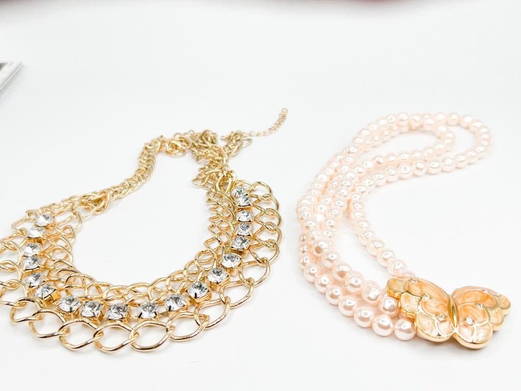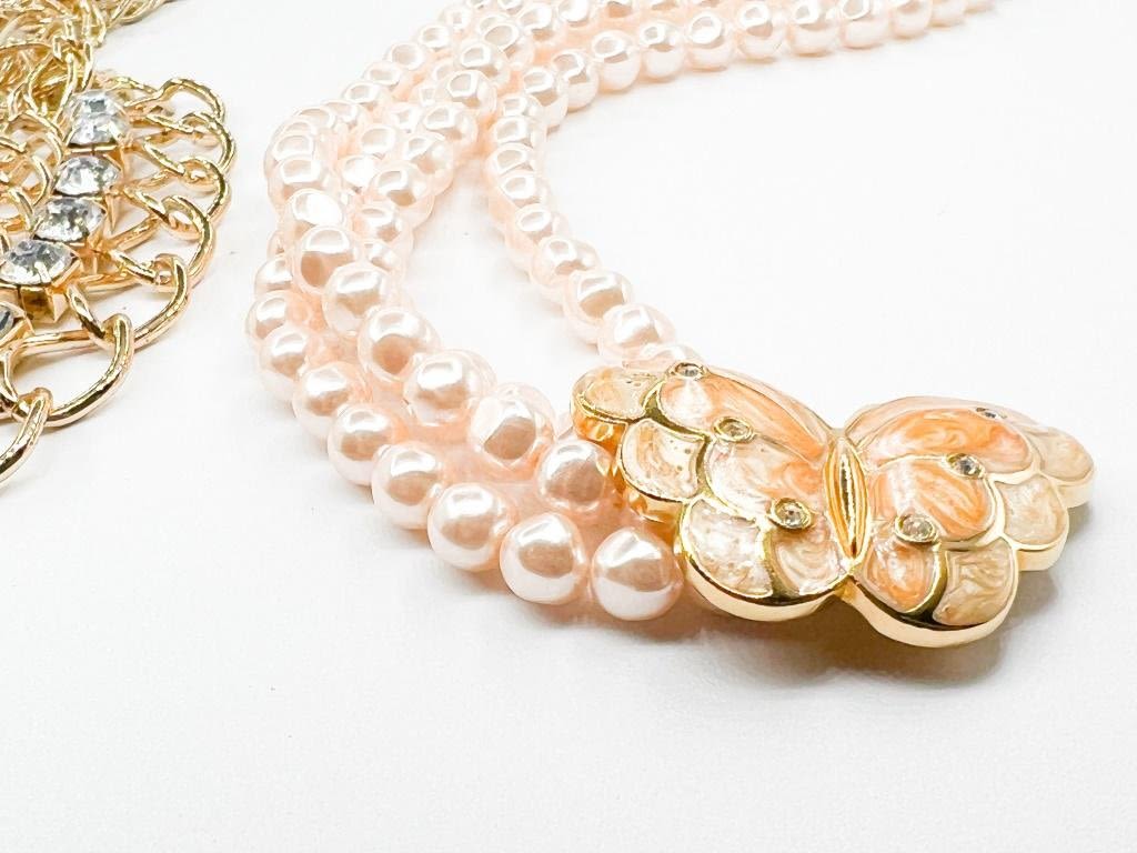 KJL FOR AVON, REALISTIC LOOK PEARLS WITH BEAUTIFUL CREAM BUTTERFLY, MATCHING EARRINGS INCLUDED, NOT PICTURED. ALSO CHAIN AND RHINESTONE NECKLACE