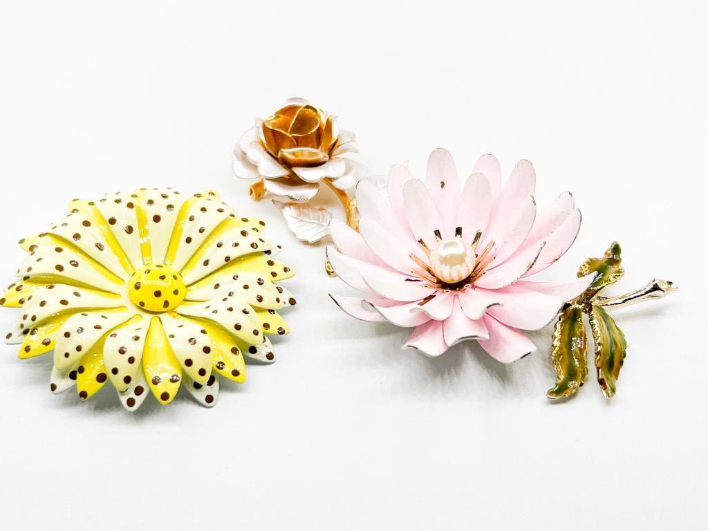 CORO PINK PASTEL, SOFT YELLOW POLKA DOT, GOLD TONE FLORAL ROSE , ALL LARGER IN SIZE, SOFT AND PRETTY