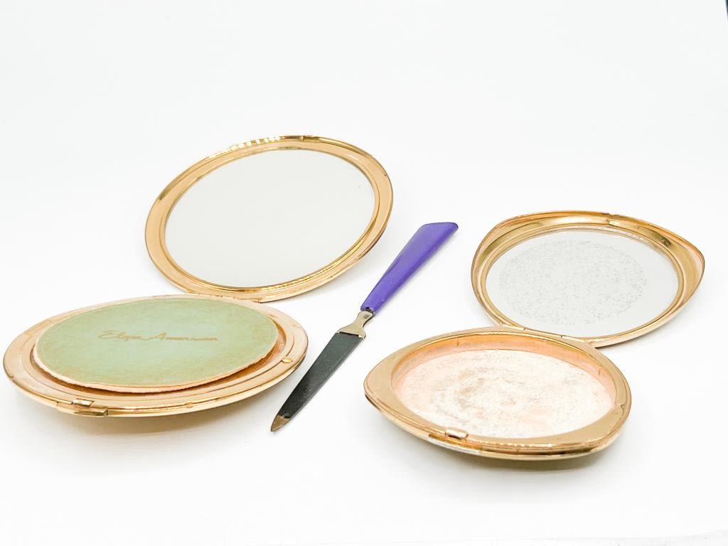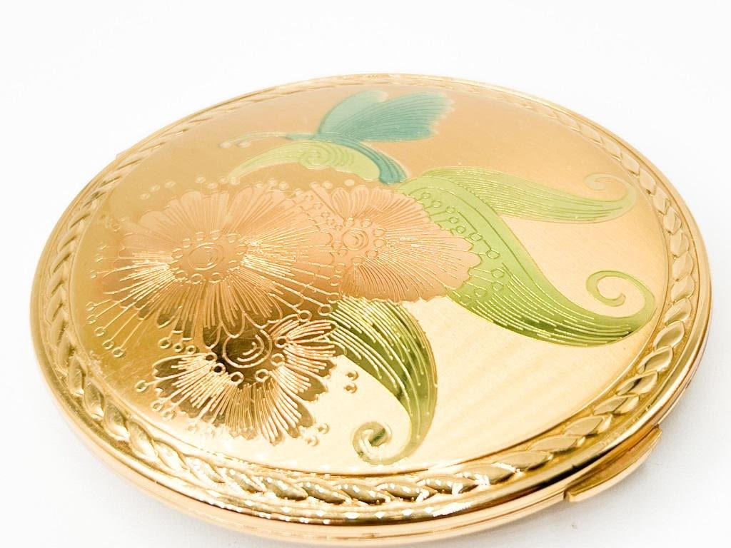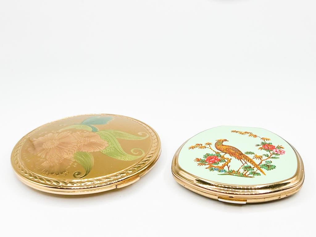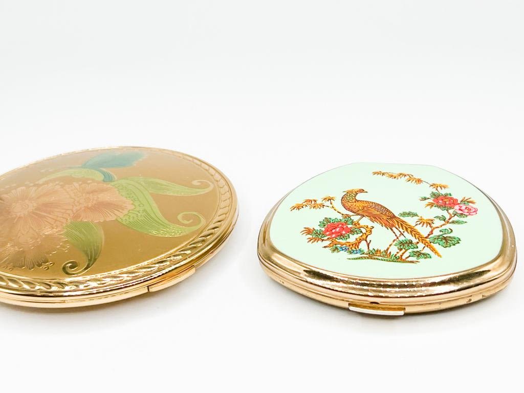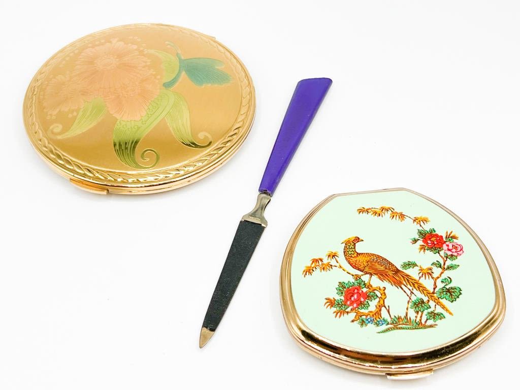 VINTAGE LUXURY COMPACTS + ITALIAN MADE NAIL FILE TWO OVERSIZE COMPACTS, ONE STRATTON, ONE ELGIN AMERICAN WITH REALLY GREAT FLORAL AND BIRD DETAIL, SPOIL YOURSELF !