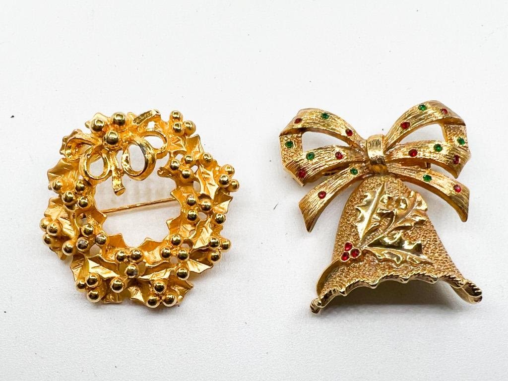 CHRISTMAS BROOCHES , ORNATE, RHINESTONES , WREATH AND BELL