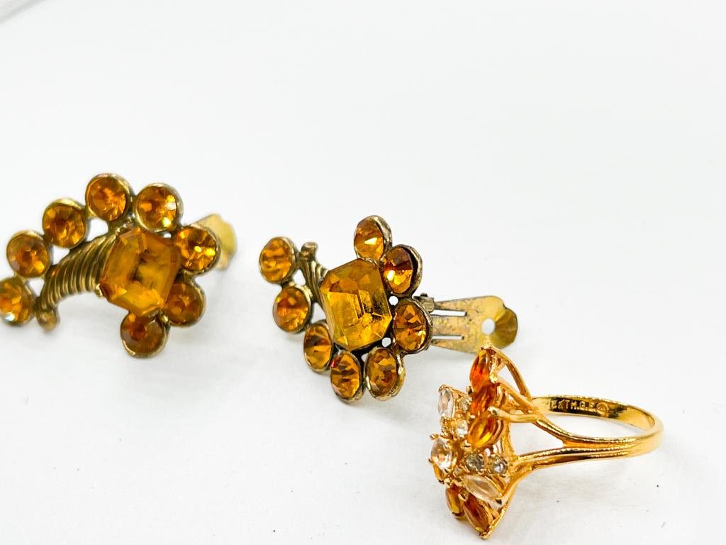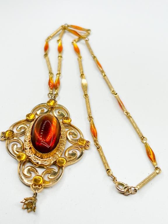 LARGE PENDANT NECKLACE, EARRINGS, RING, IN AMBER TONES