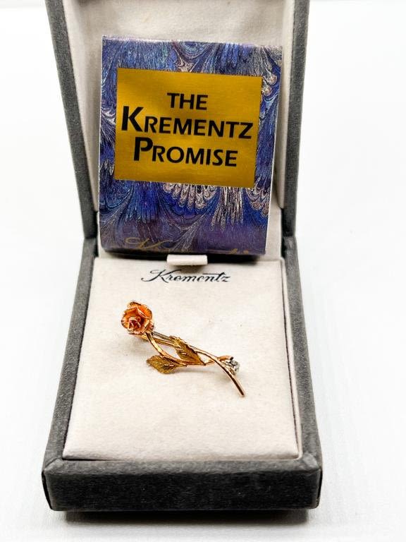 KREMENTZ ROSE FLORAL PIN W CASE, AND KREMENTZ ADVERTISEMENT BOOKLET