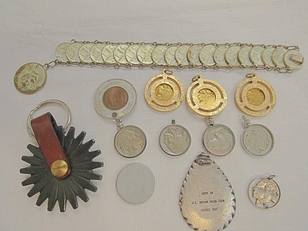 ONE WALKING LIBERTY HALF DOLLAR KEYCHAIN, MERCURY DIME TOCKEN, ONE MEXICO 1960’S BRACELET, ONE LUCKY PENNY 1953, NINE BUFFALO NICKEL CHARMS