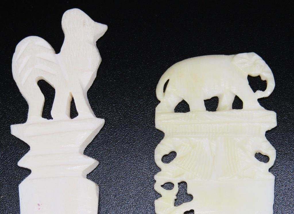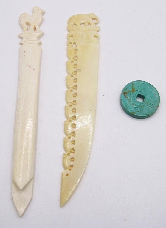 (2) CARVED LETTER OPENERS; ONE WITH AN ELEPHNAT ONE WITH A ROOSTER? AND A CARVED STONE