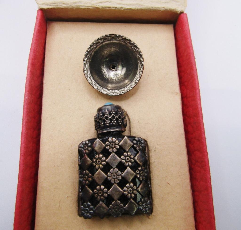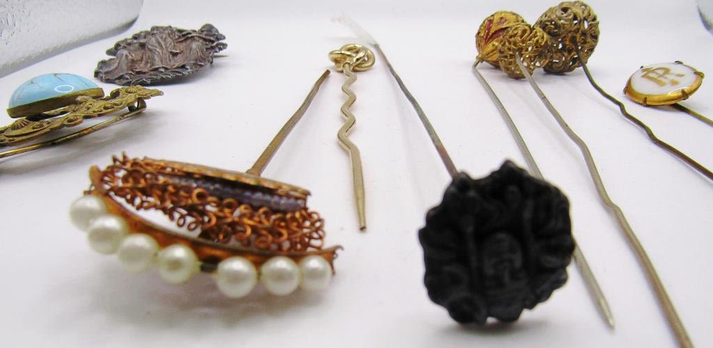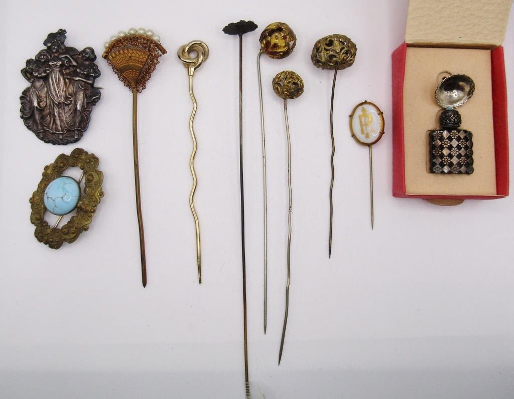 (9) LONG HAT PINS; ONE TINY PERFUME BOTTLE WITH FUNNEL TO REFILL!