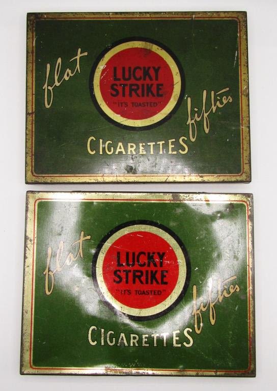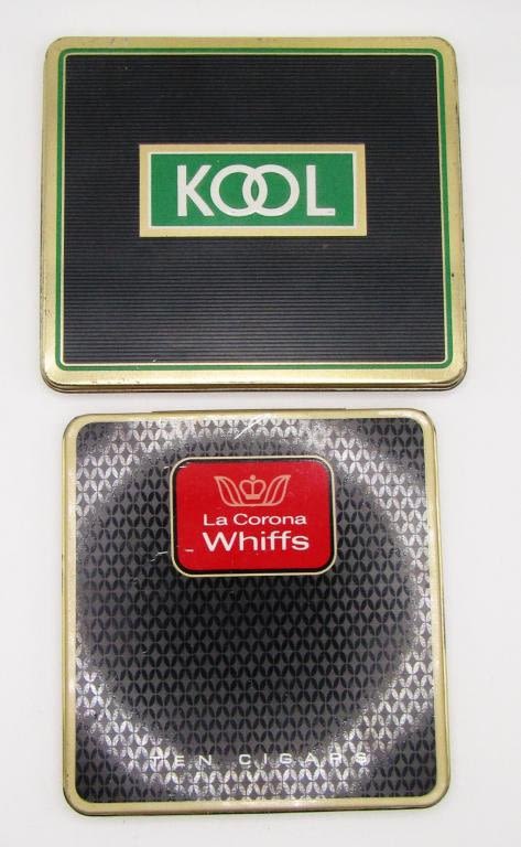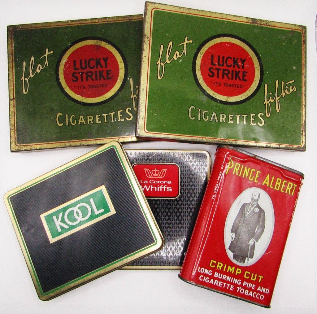 (2) LUCKY STRIKE CIGARETTES FLAT FIFTIES TIN BOXES, KOOL TIN CASE, LA CORONA WHIFFS TEN CIGARS AMERICAN CIGAR CONTAINER MADE IN ENGLAND, PRINCE ALBERT CRIMP CUT LONG BURNING PIPE AND CIGARETTE TOBACCO TIN CASE!