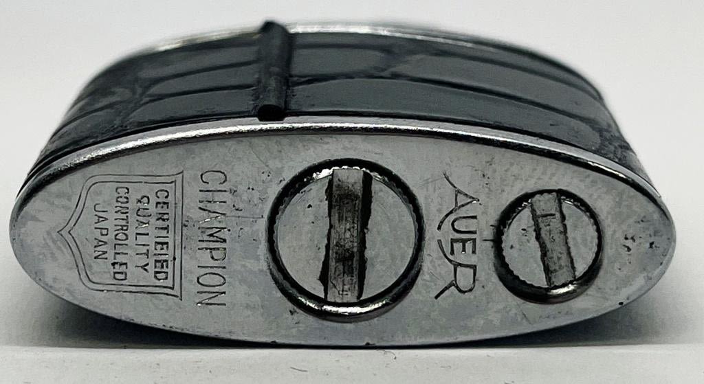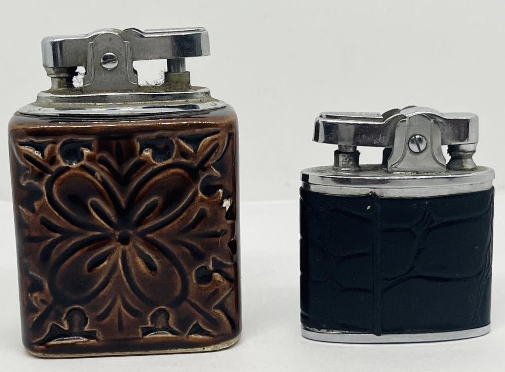 ONE CERAMIC WITH BROWN DESIGN, ONE SMALLER LIGHTER WITH BLACK "FAUX LEATHER" DESIGN MARKED "CHAMPION, AUER"
