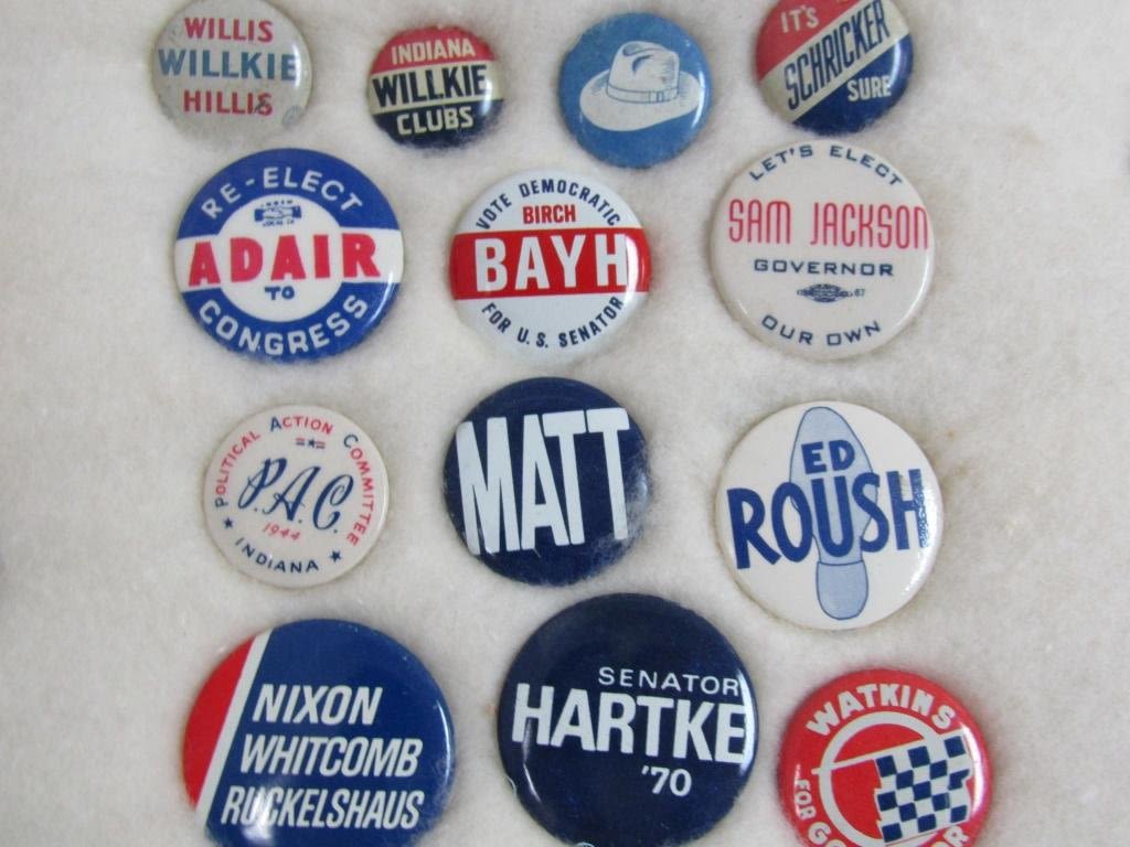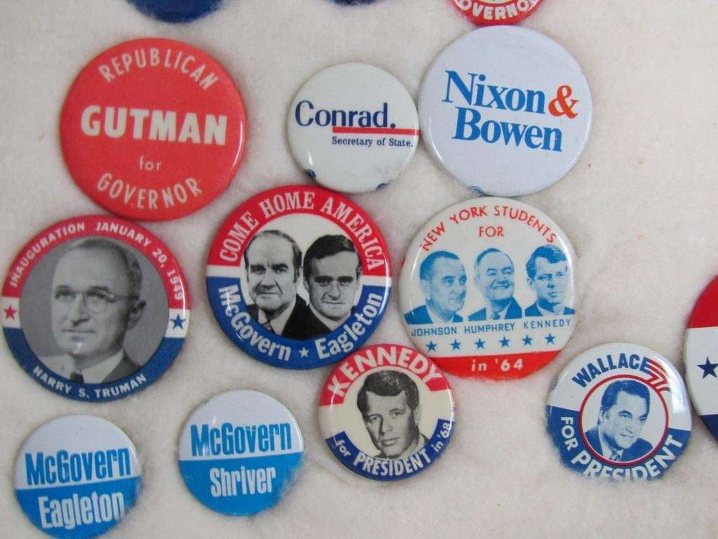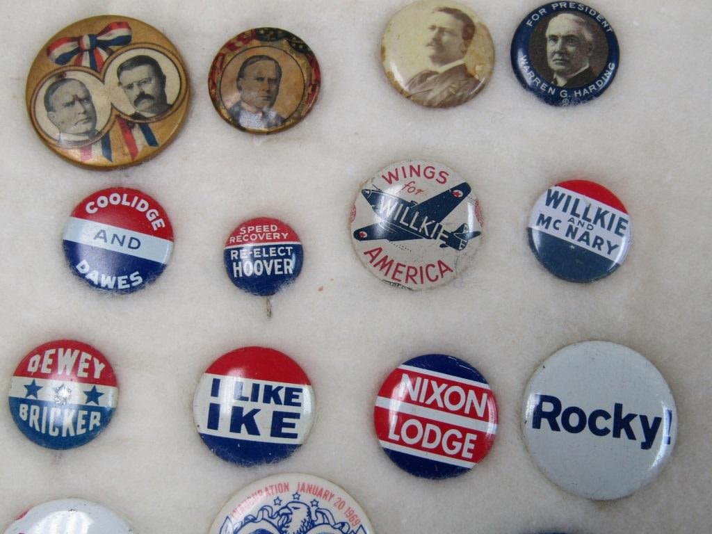 TEDDY ROOSEVELT, WARREN G HARDING, HOOVER, IKE, HUMPHREY, McCARTHY, KENNEDY, TRUMAN, F.D.R & OTHER UNIQUE & COLLECITBLE PINS / BUTTONS – IN ORIGINAL DISPLAY CASE