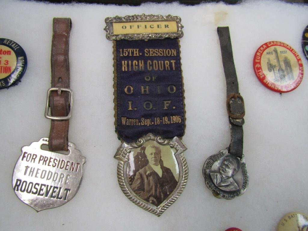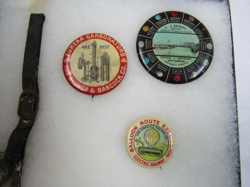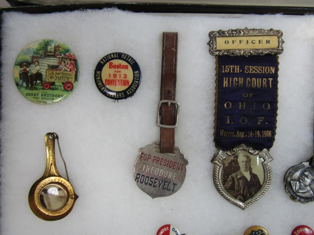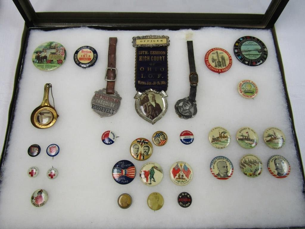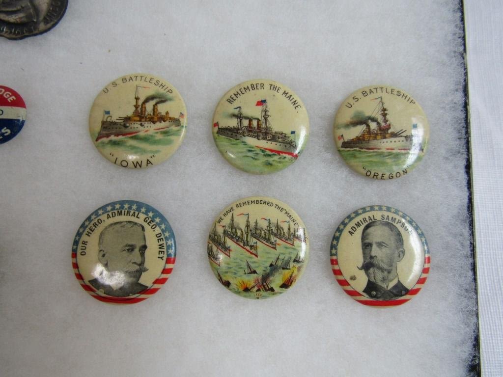 UNIQUE COLLECTIONS – ORIGINAL DISPLAY – BATTLESHIPS & OUR HERO PINS, SEVERAL EARLY DATE POLITIAL PINS, (1) BLACK AMERICANA HISTORY, 15th SESSION HIGH COURT of OHIO 1906 RIBBON, ROOSEVELT METAL FAB, WILLIAM H TAFT