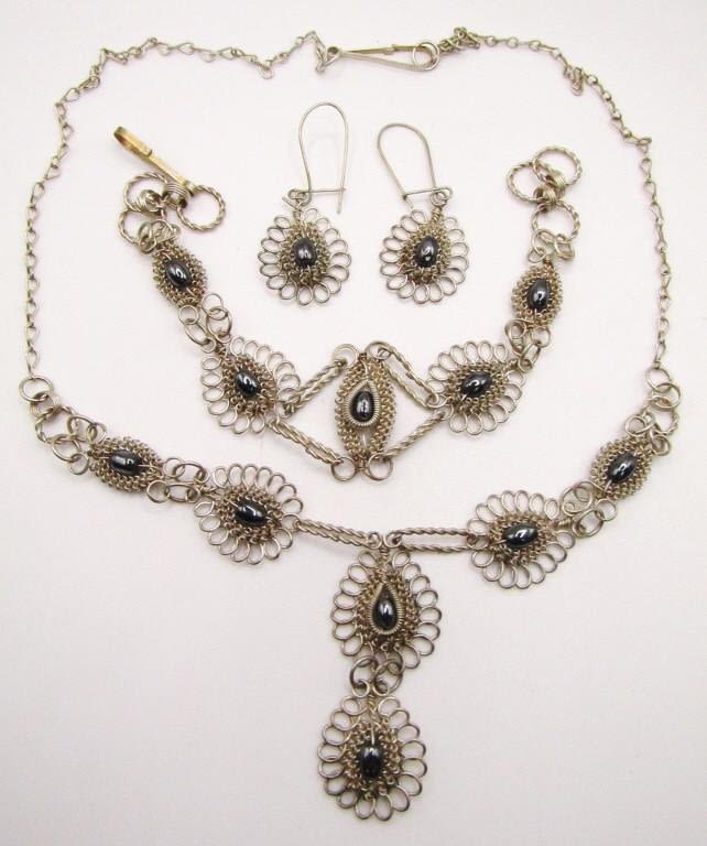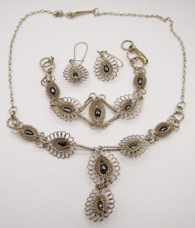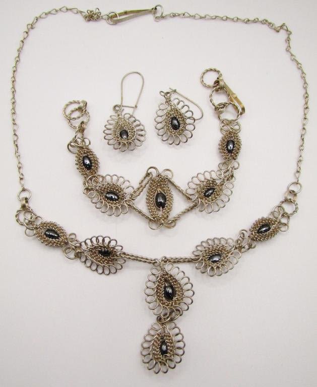WITH GRAY BEAD ACCENTS WITH MATCHING BRACELET AND PIERCED DANGLY EARRINGS-TOTAL 11.8 DWT