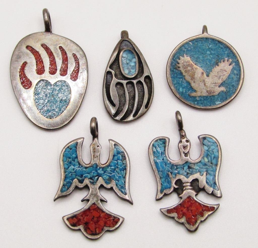 CHIPPED TURQUOISE AND RED CORAL INLAY DESIGN-THUNDERBIRD-BEAR CLAW-TOTAL 15.2 DWT
