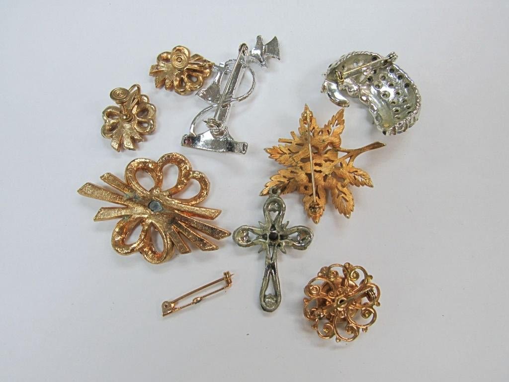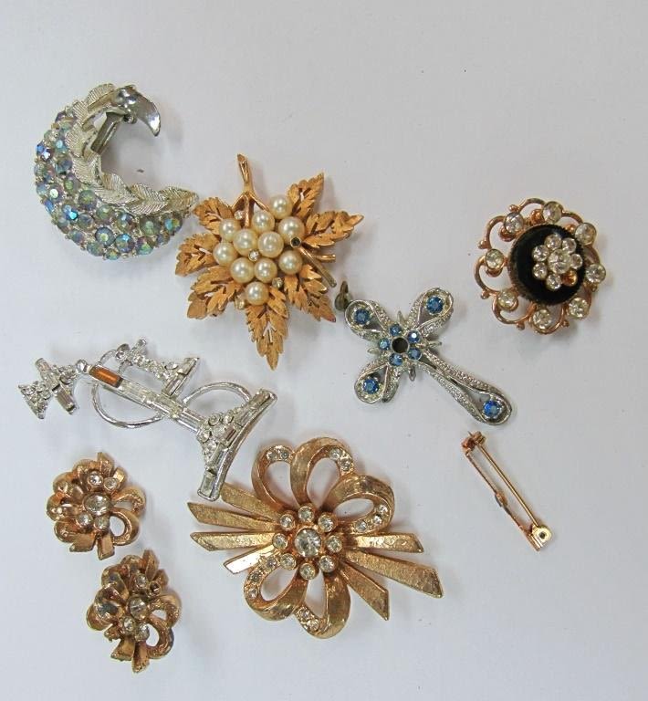 RHINESTONES, MOON, CROSS, BROOCHES, EARRINGS, FAUX PEARL, LEAF– EACH ITEM IS MISSING EITHER RHINESTONE/S OR CLASP