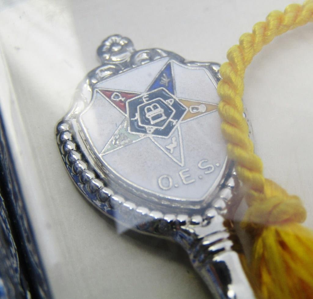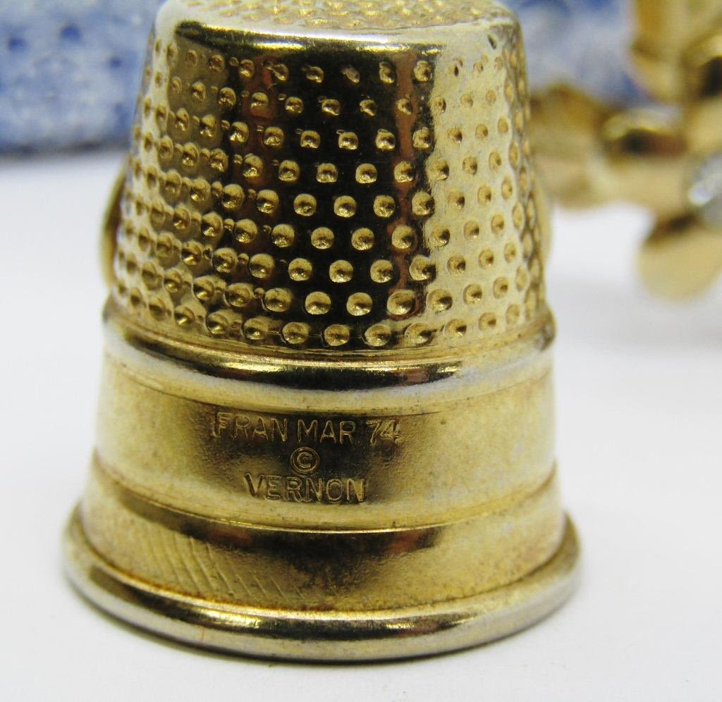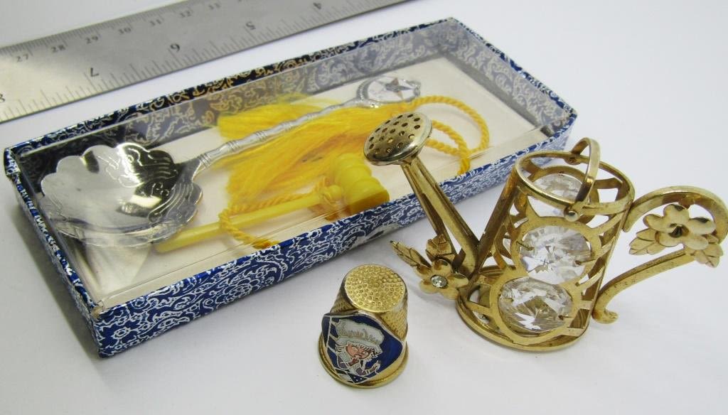 VINTAGE GOLD TONED GARDEN WATERING CAN TRINKET W/ FLOWERS AND INLAID RHINESTONE(1 STONE MISSIING) 1-GOLD TONED THIMBLE W/ ENAMAL BETSY ROSS STITCHING FLAG 1-SILVER TONED MASONIC SPOON W/ YELLOW TASSLE AND