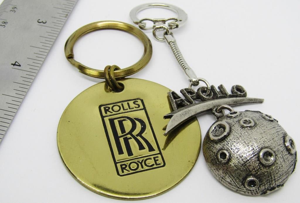 1-LARGE ROUND ROLLS ROYCE GOLD TONED KEYCHAIN 1-SILVER TONED "APOLLO" MOON KEY CHAIN