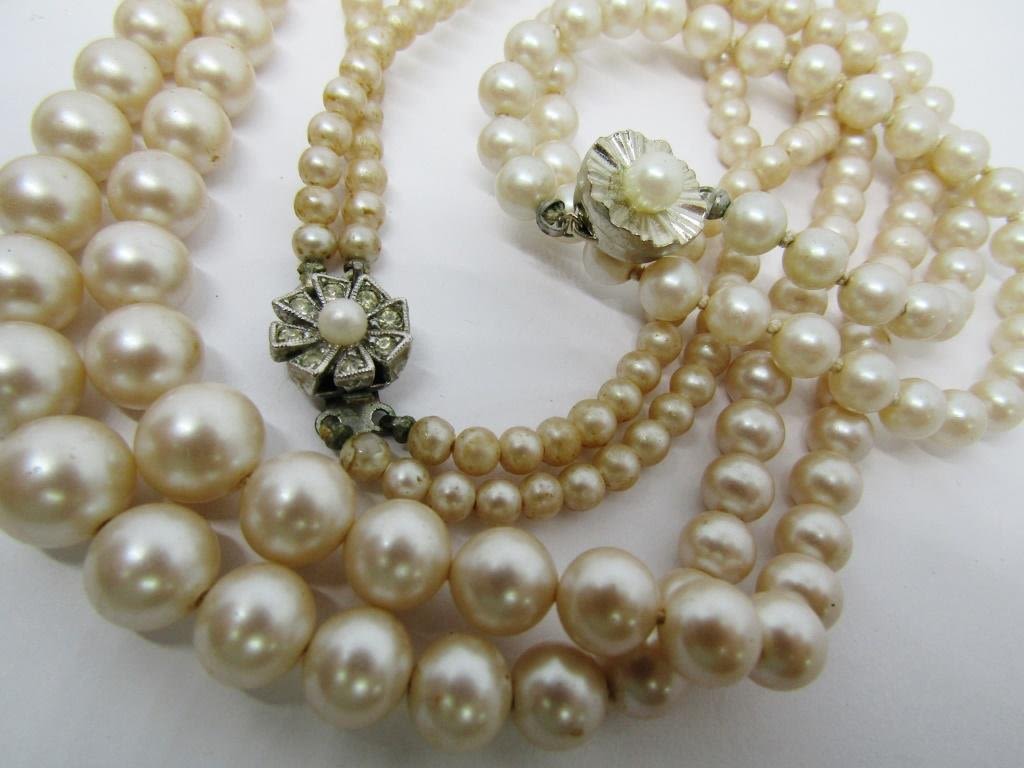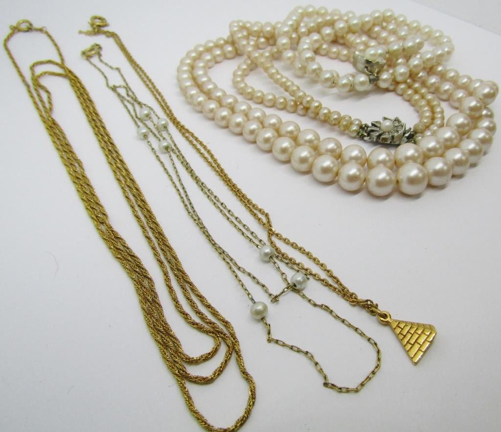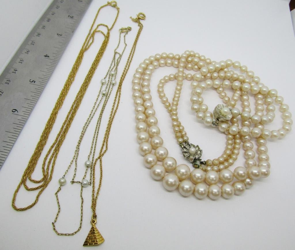1-SHORT GOLD TONED CHAIN W/ SMALL PYRAMID PENDANT 1-LONG TWISTED GOLD TONED CHAIN 1-THIN GOLD TONED CHAIN LINK WITH FAUX PEARLS 1-SHORT FAUX PEARL NECKLACE W/ SILVER TONED CLASP & INLAID PEARL 1-LONG TIERED FAUX