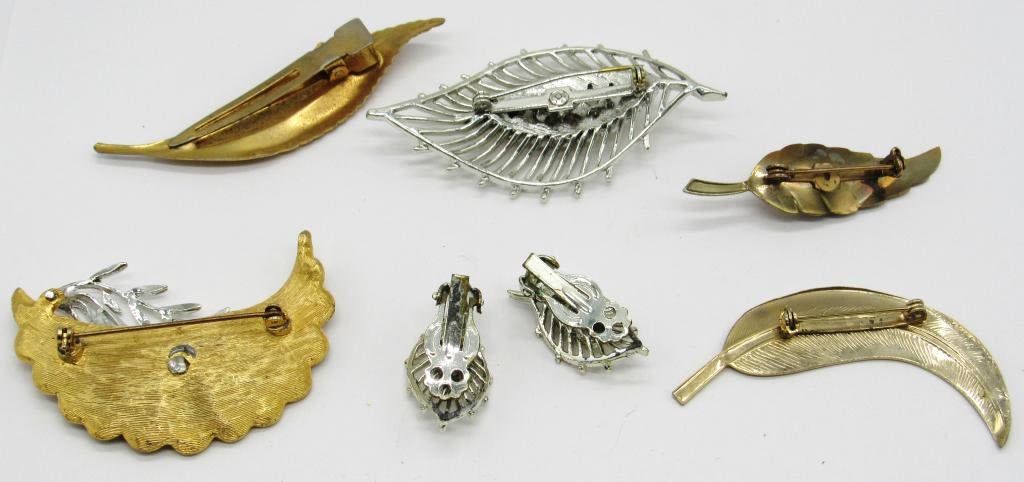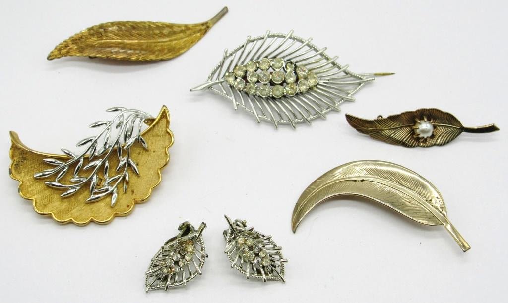 4 GOLD TONED LEAF PINS, 1 SILVER TONED LEAF PIN & MATCHING EARRINGS W/ RHINESTONES