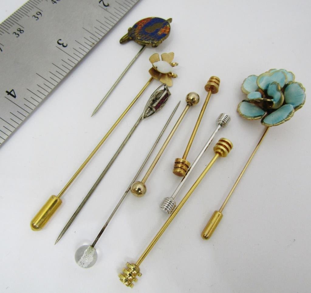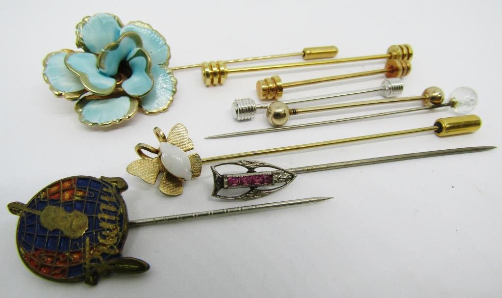 4-ASSORTED SILVER AND GOLD TONED TIE PINS 1-STICK PIN W/ CLEAR BEAD 1-STICK PIN W GOLD TONED BUTTERFLY AND PEARL COLORED STONE 1-GOLD TONE TEAL PAINTED FLOWER STICK PIN 1-HOFFSTATTER BONN GUITAR & GLOBE GOLD TONE