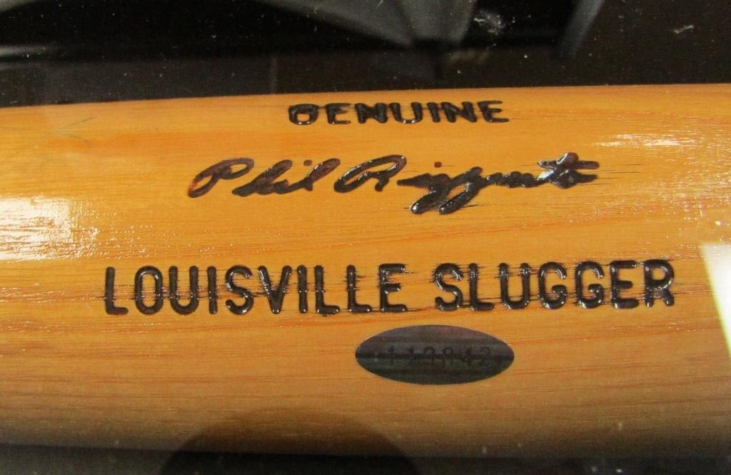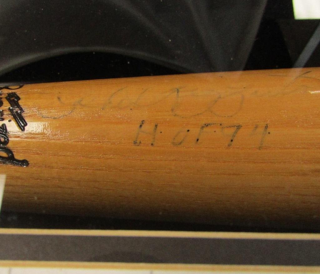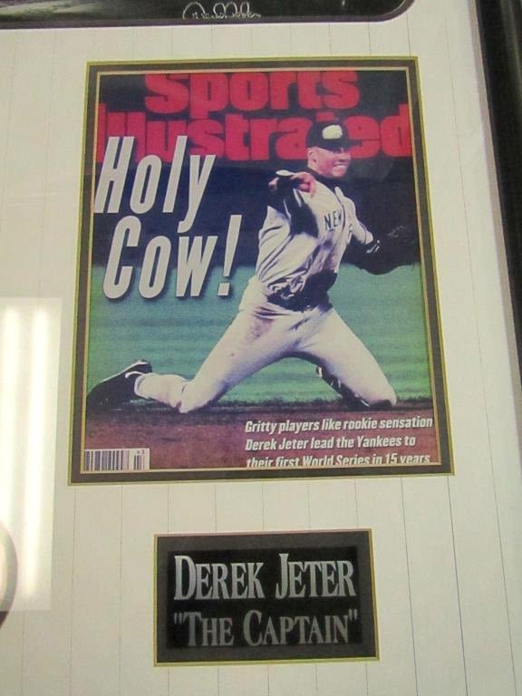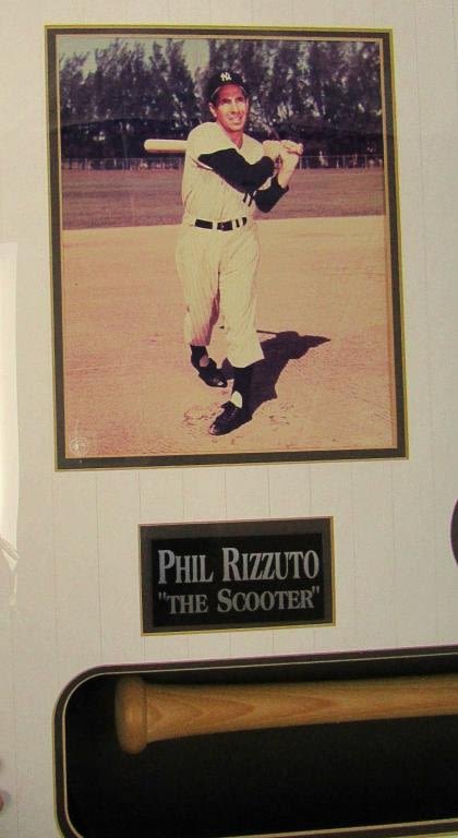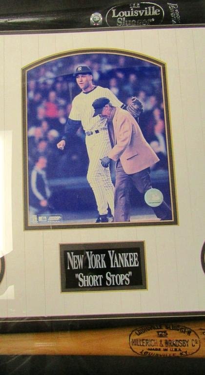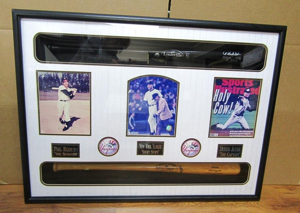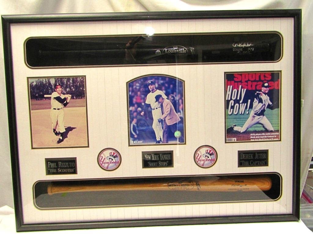 PHIL RIZZUTO & DEREK JETER AUTOGRAPHED LOUISVILLE SLUGGER BATS in LARGE FRAMED DISPLAY with 8×10 PHOTO’S – DISPLAY MEASURES 42" x 31" x 4" DEEP – EXACT SHIPPING COST REQUIRED – LARGE PIECE