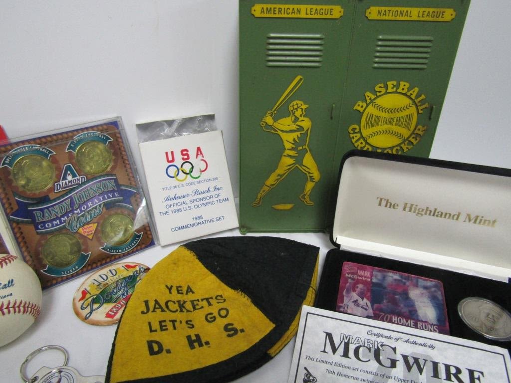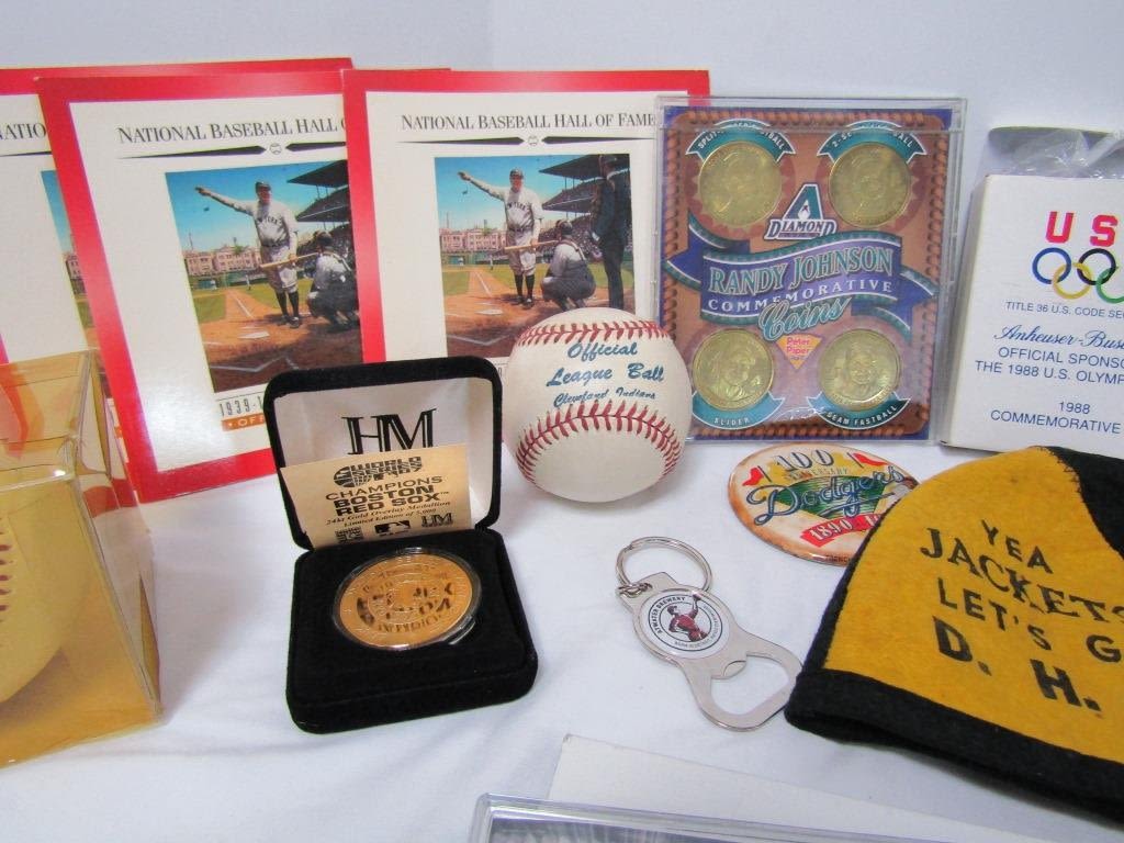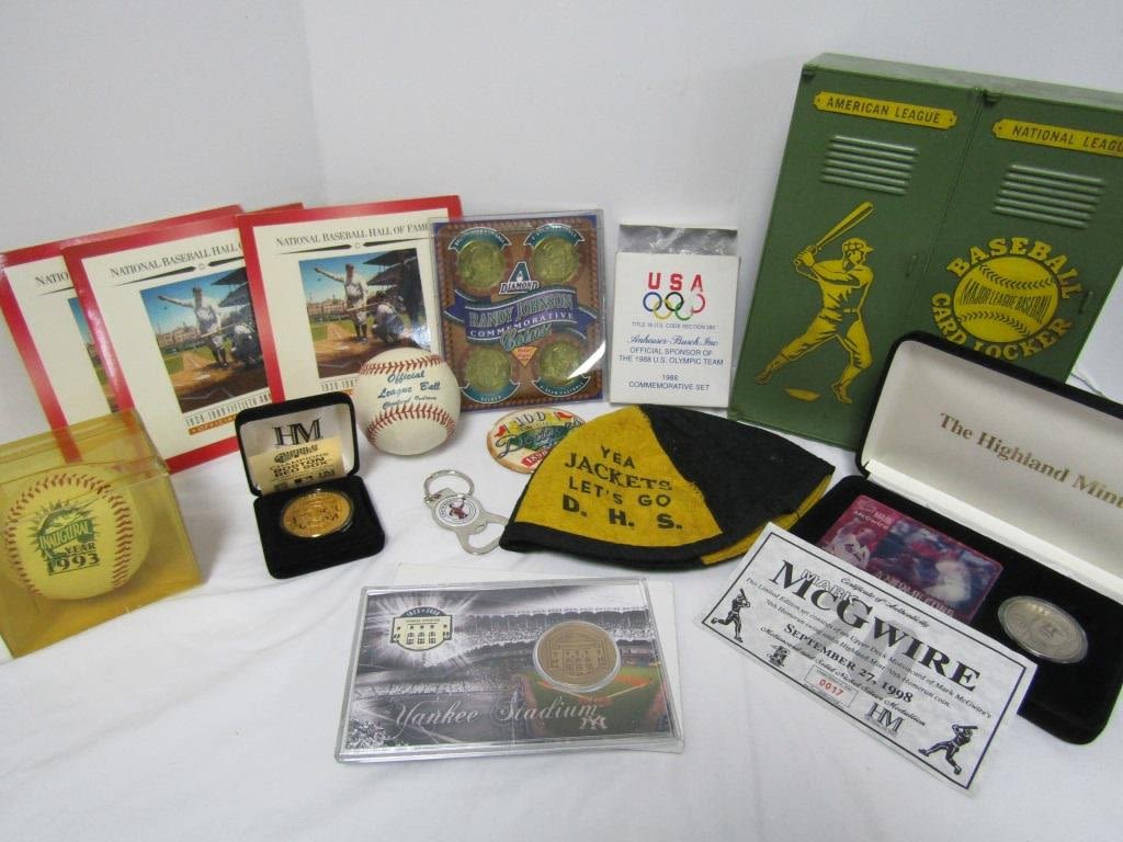 TRIBUTE BALLS, HALL of FAME TRIBUTE COINS, VINTAGE LOCKER for CARDS, ANHEUSER-BUSCH OLYMPIC PINS, YEA JACKETS VINTAGE CAP & MORE