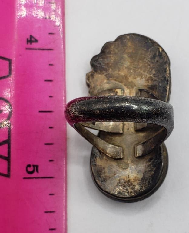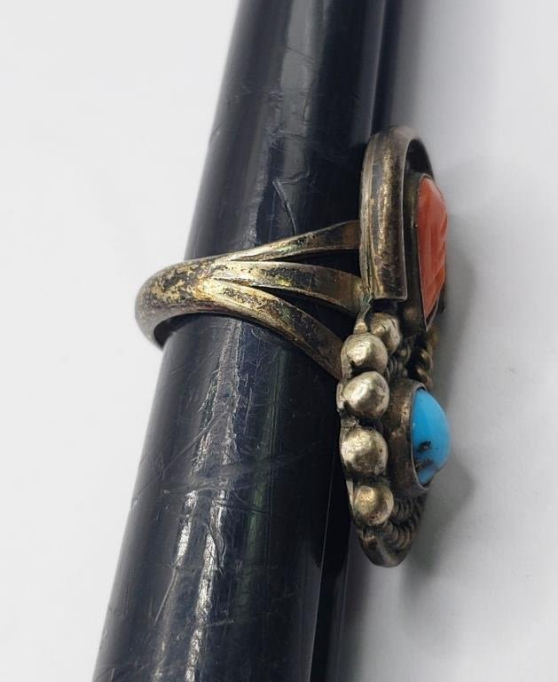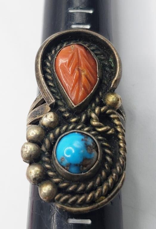 WITH RED CORAL AND TURQUOISE STONES-RING SIZE 5-TOTAL 7 DWT