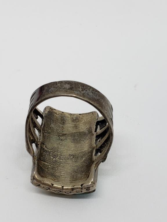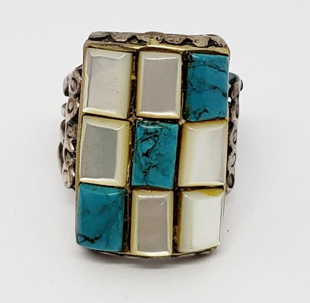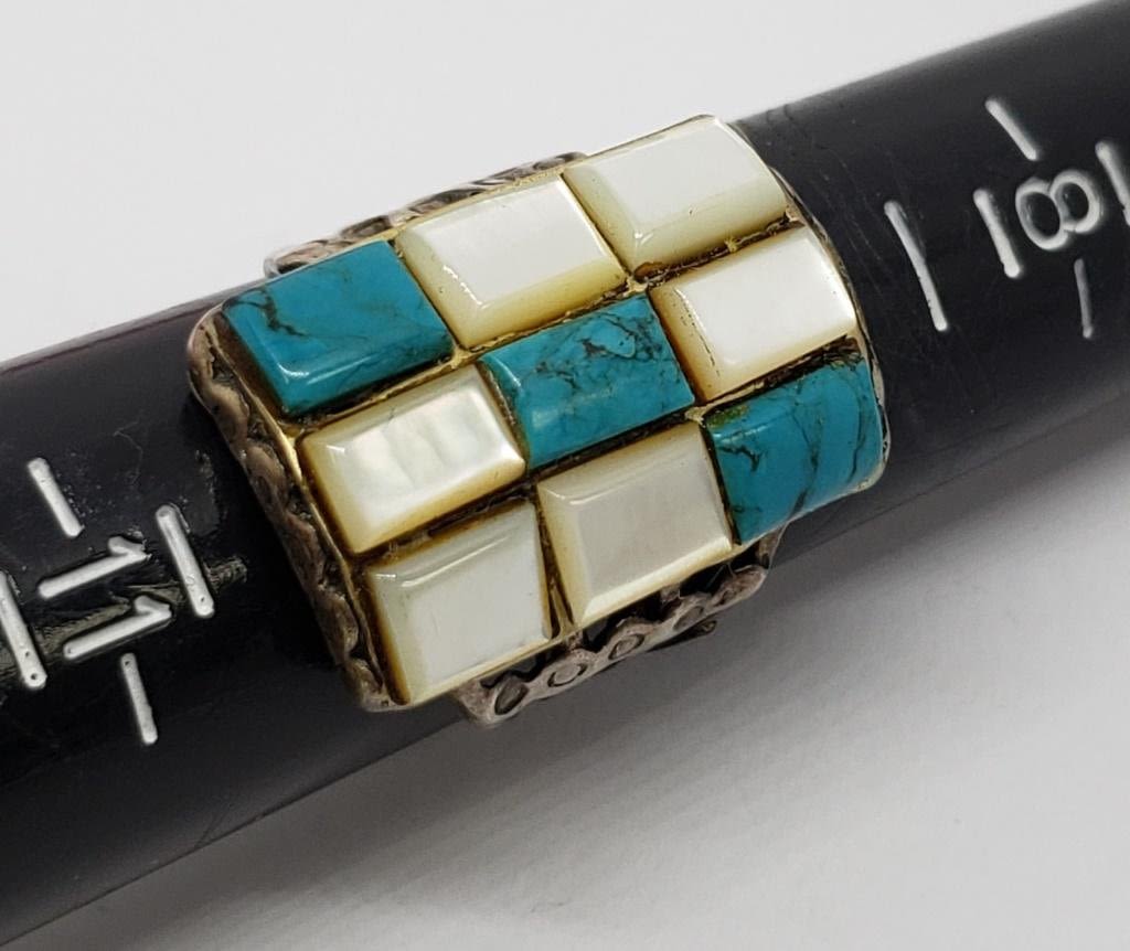 AND MOTHER OF PEARL ZUNI DESIGN-CUT OUT DESIGN ON BAND-RING SIZE 10-TOTAL 7.9 DWT