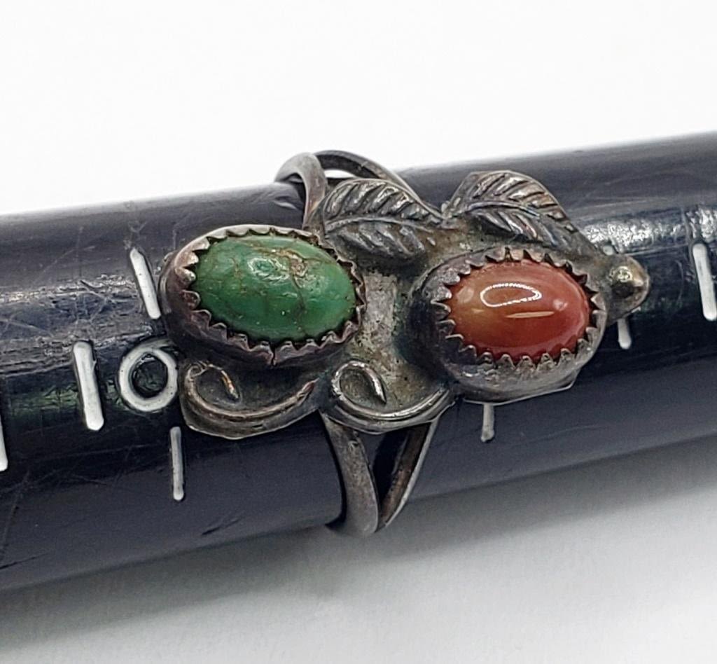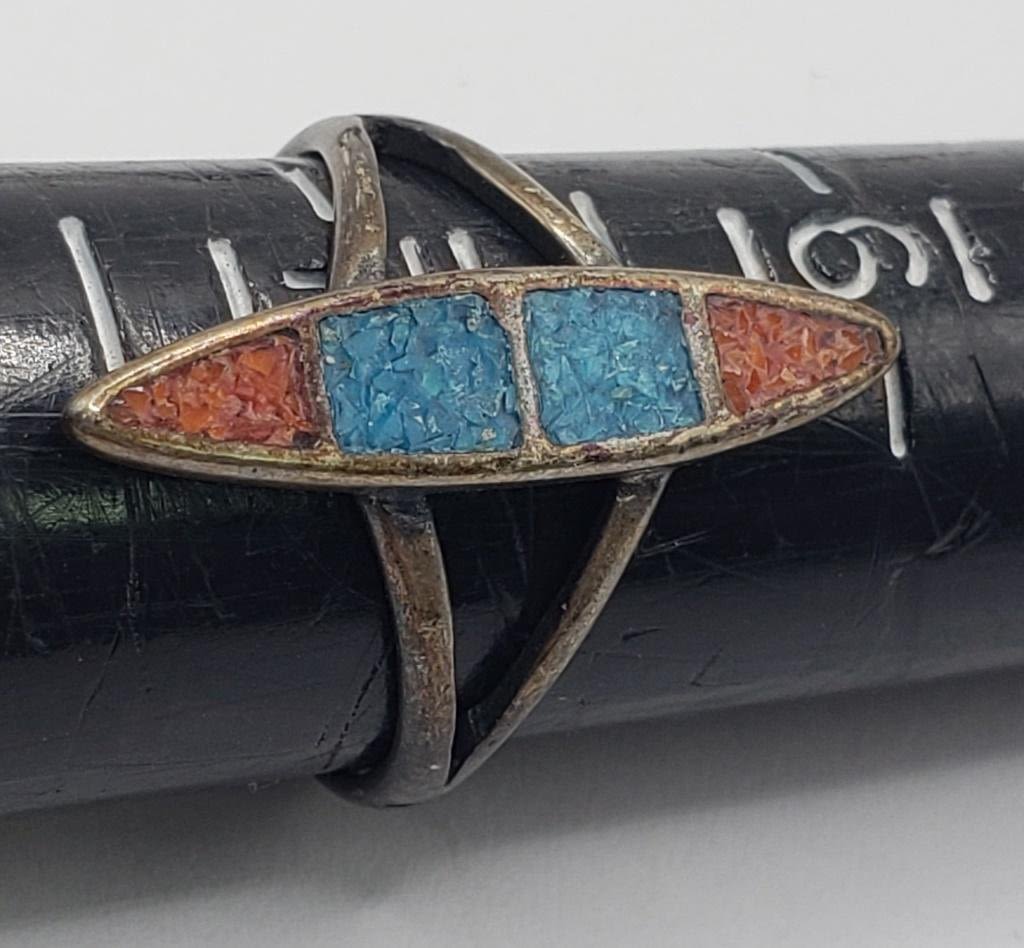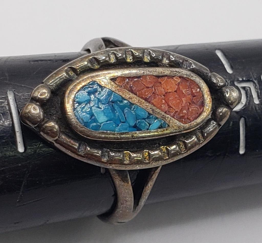 RED CORAL AND GREEN TURQUOISE STONES (2)WITH CHIPPED RED CORAL AND TURQUOSE INLAY DESIGN-VARIOUS SIZES 5.5-6.5-TOTAL 6.1 DWT