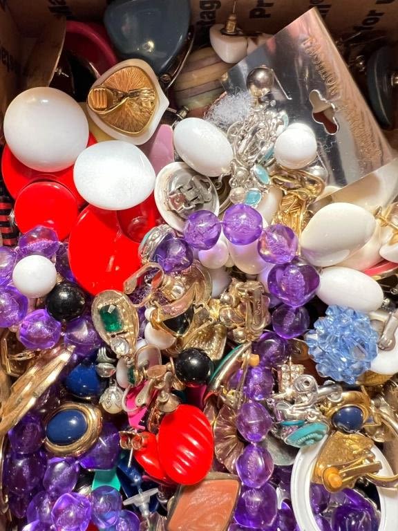 EARRINGS TREASURE BOX SAMPLER, MATED PAIRS, 95PERCENT + WEARABLE CONDITION ITEMS !GREAT FOR PERSONAL COLLECTION OR SHARE WITH FRIENDS ! SMALL PRIORITY MAIL IN HOUSE SHIPPING MEANS YOU GET IT FAST ! FUN STUFF !!!