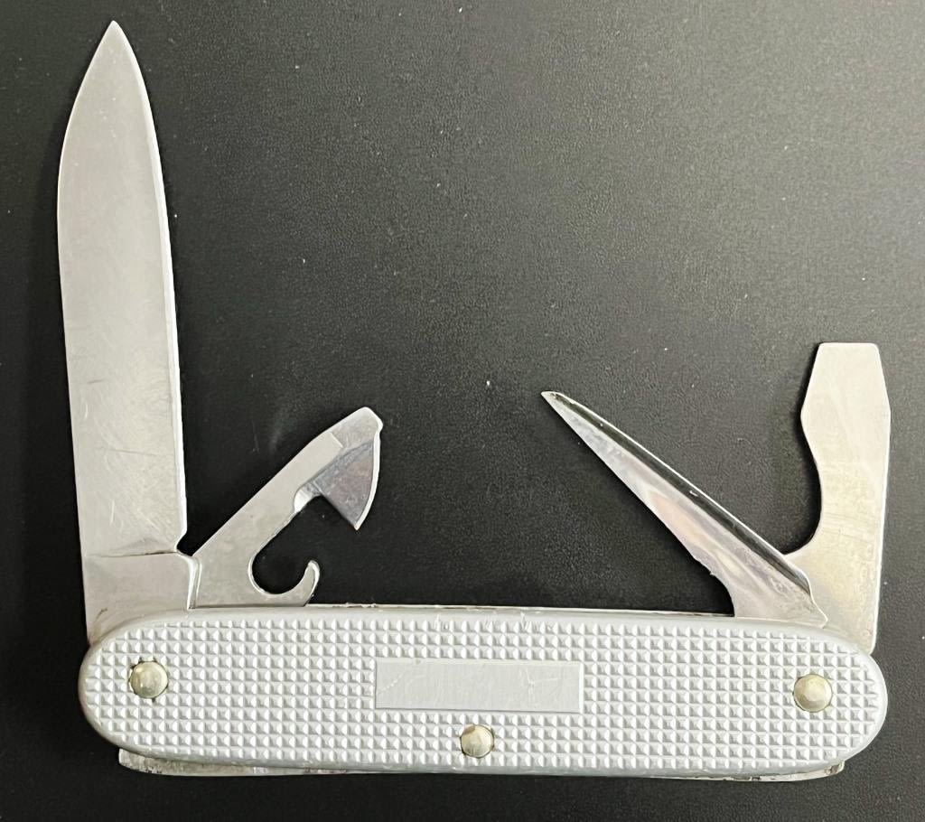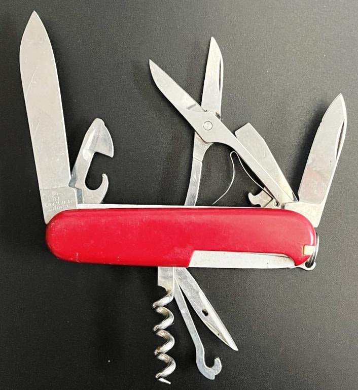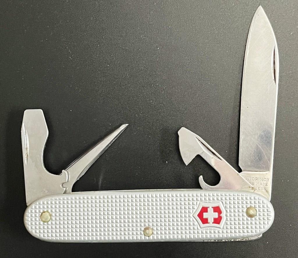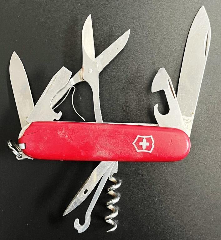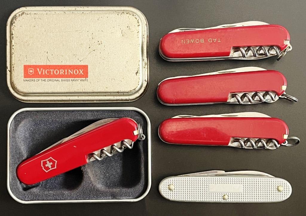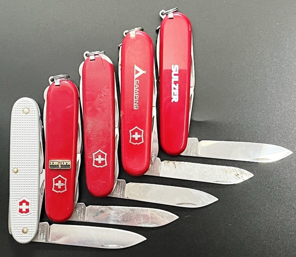 4 Red Swiss Army Multi-Tool knives one in a tin case, 1 Silver Swiss Army brand knife. Marked Victorinox Switzerland