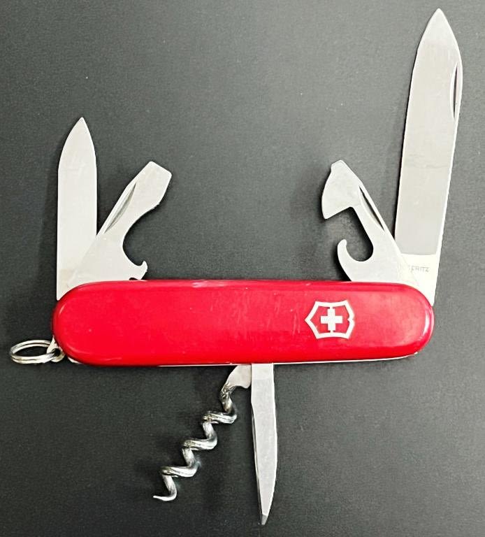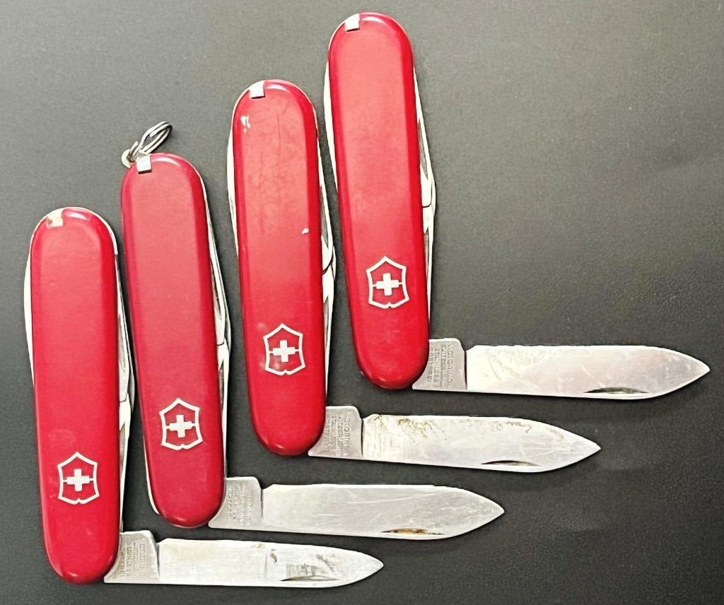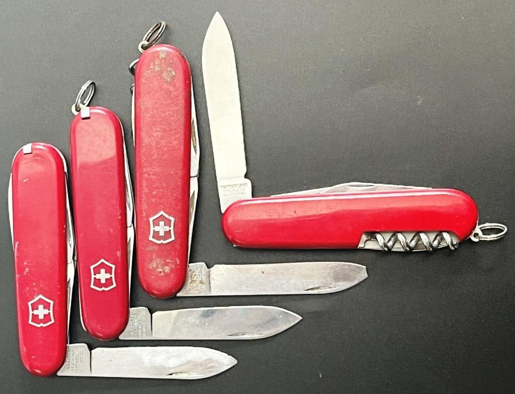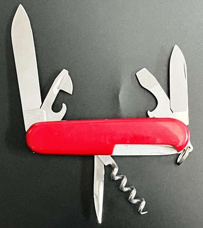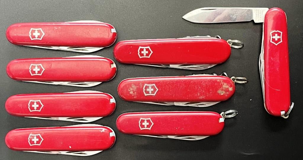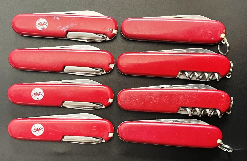 8 Red Swiss Army brand pocket knives, Marked Switzerland Stainless, 7 marked Officier Suisse 1 marked Hoffritz