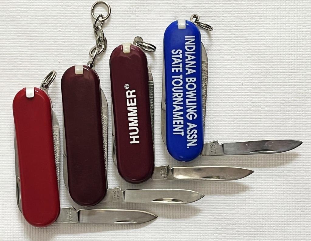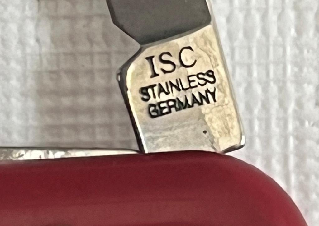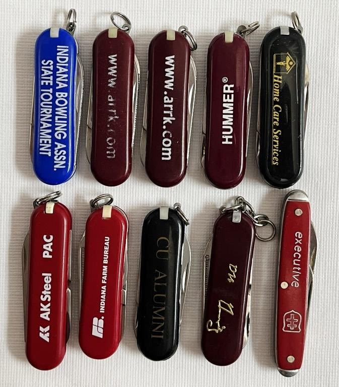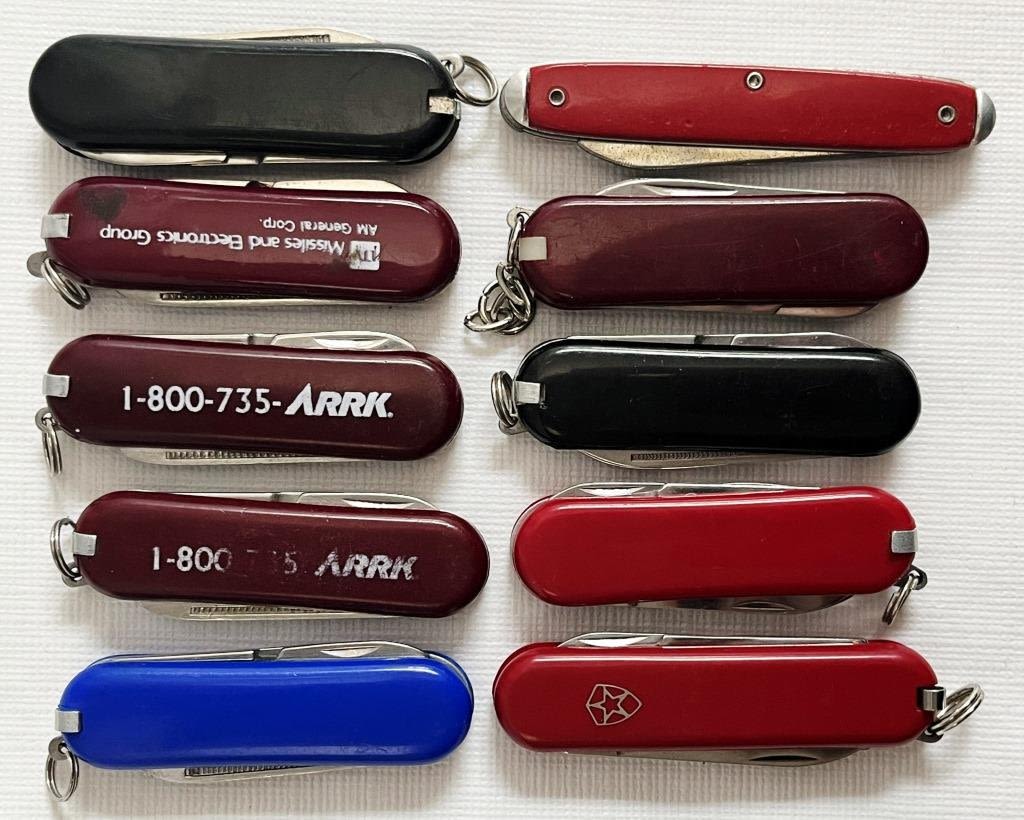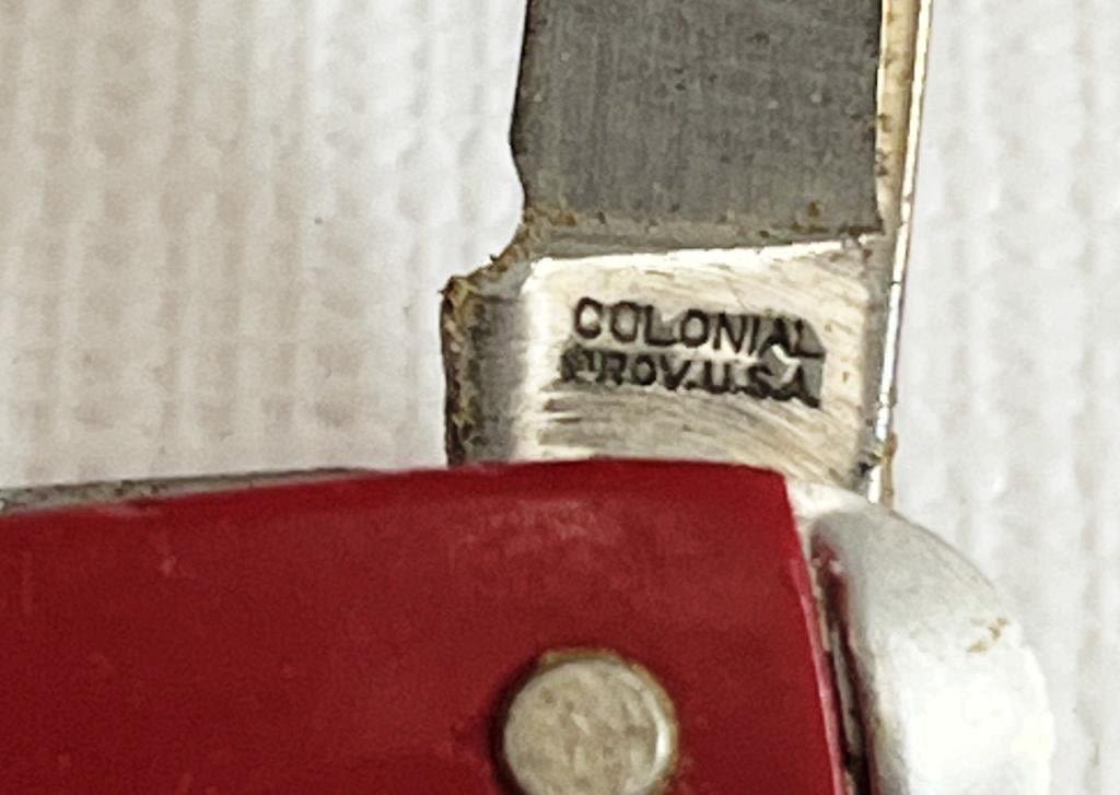 7 red pocket knives, 1 blue, 2 black. 8 Marked Stainless Steel, 1 marked colonial, 1 marked stainless Germany