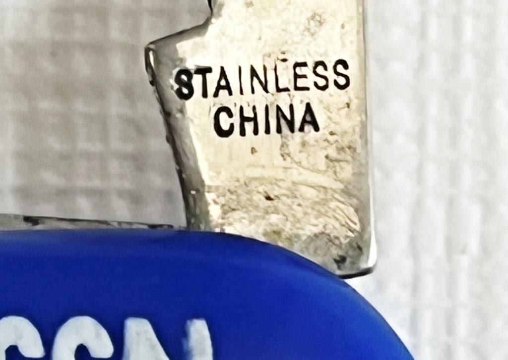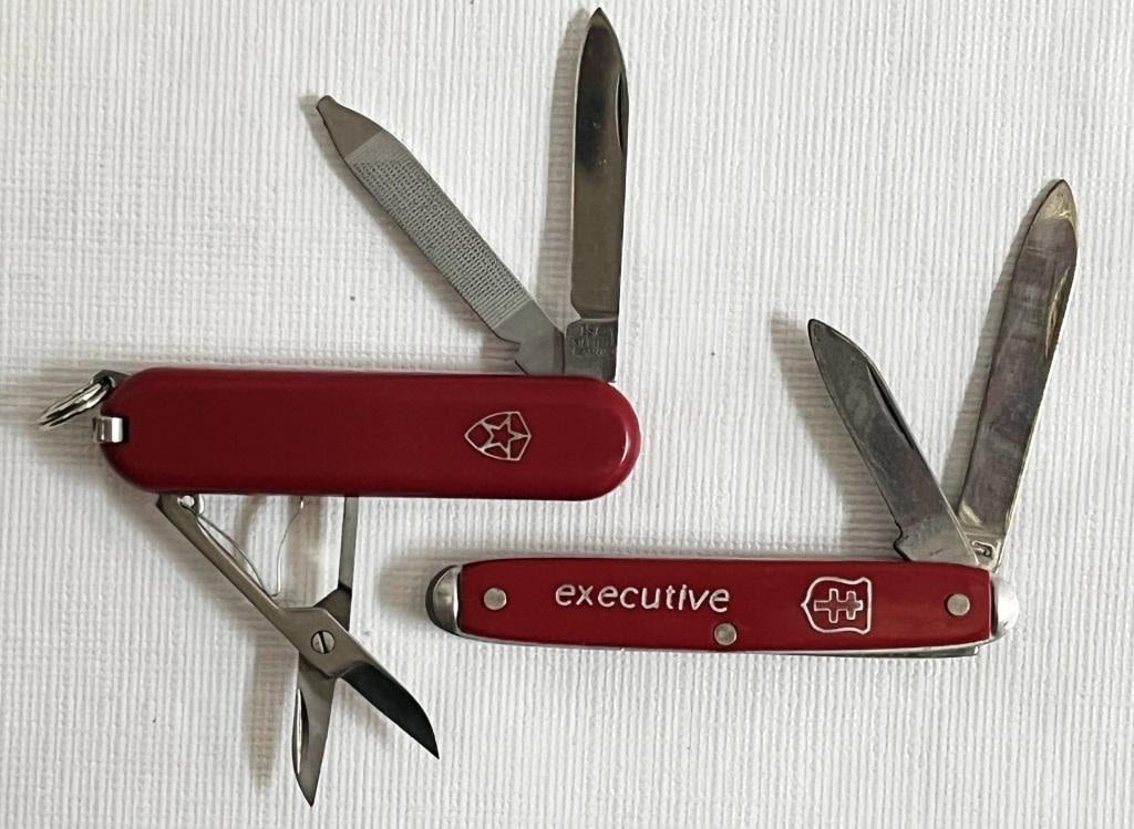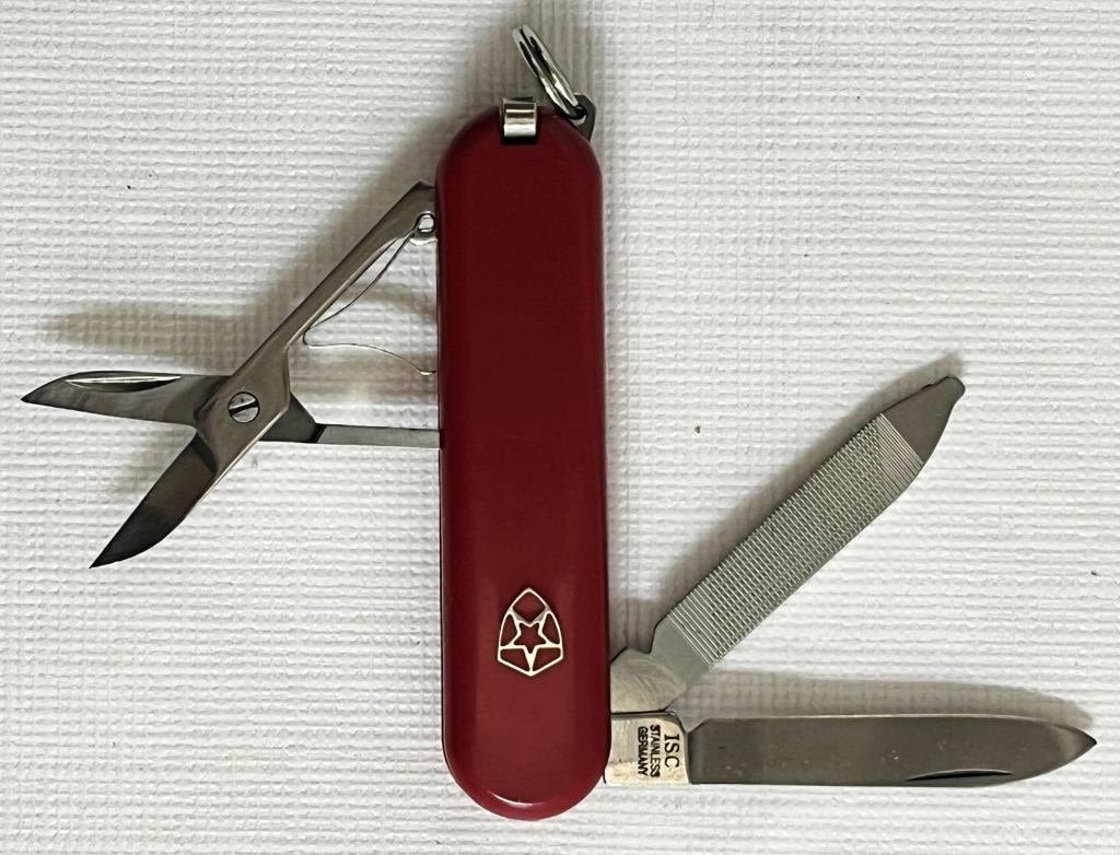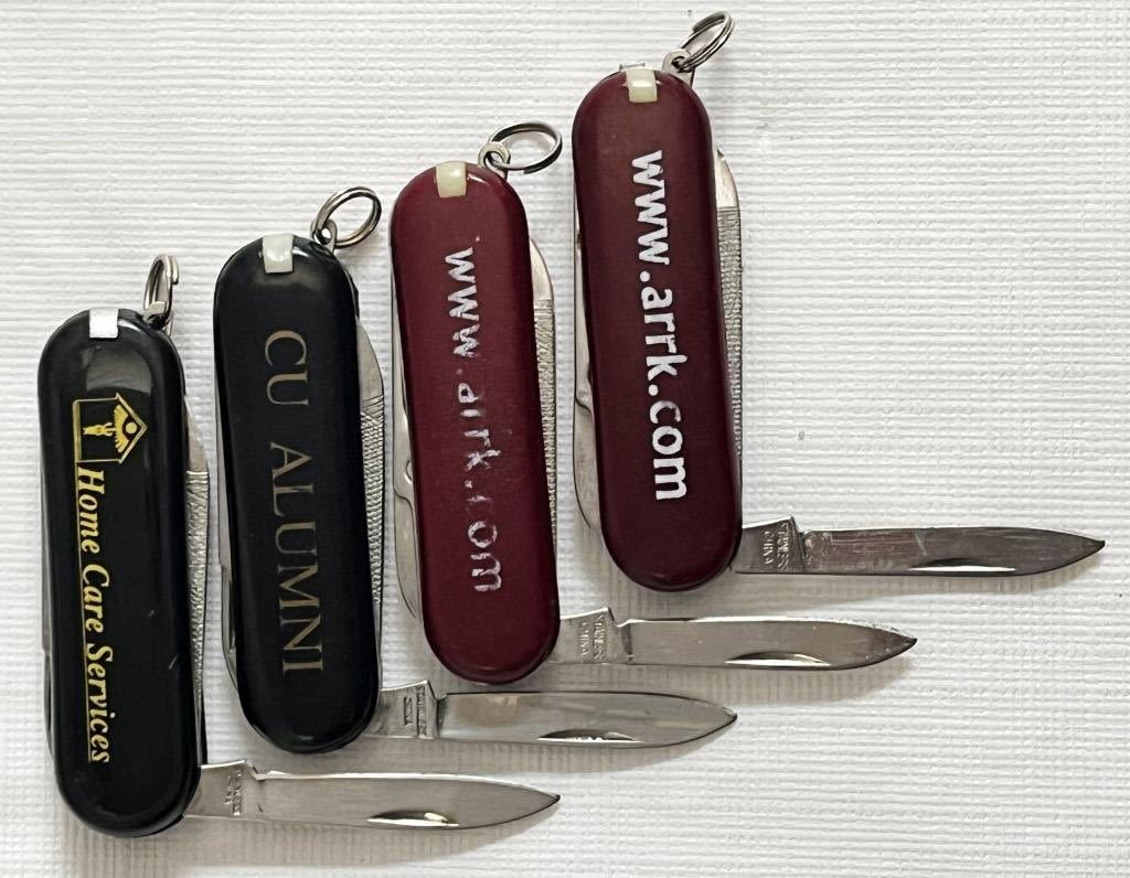 7 red pocket knives, 1 blue, 2 black. 8 Marked Stainless Steel, 1 marked colonial, 1 marked stainless Germany