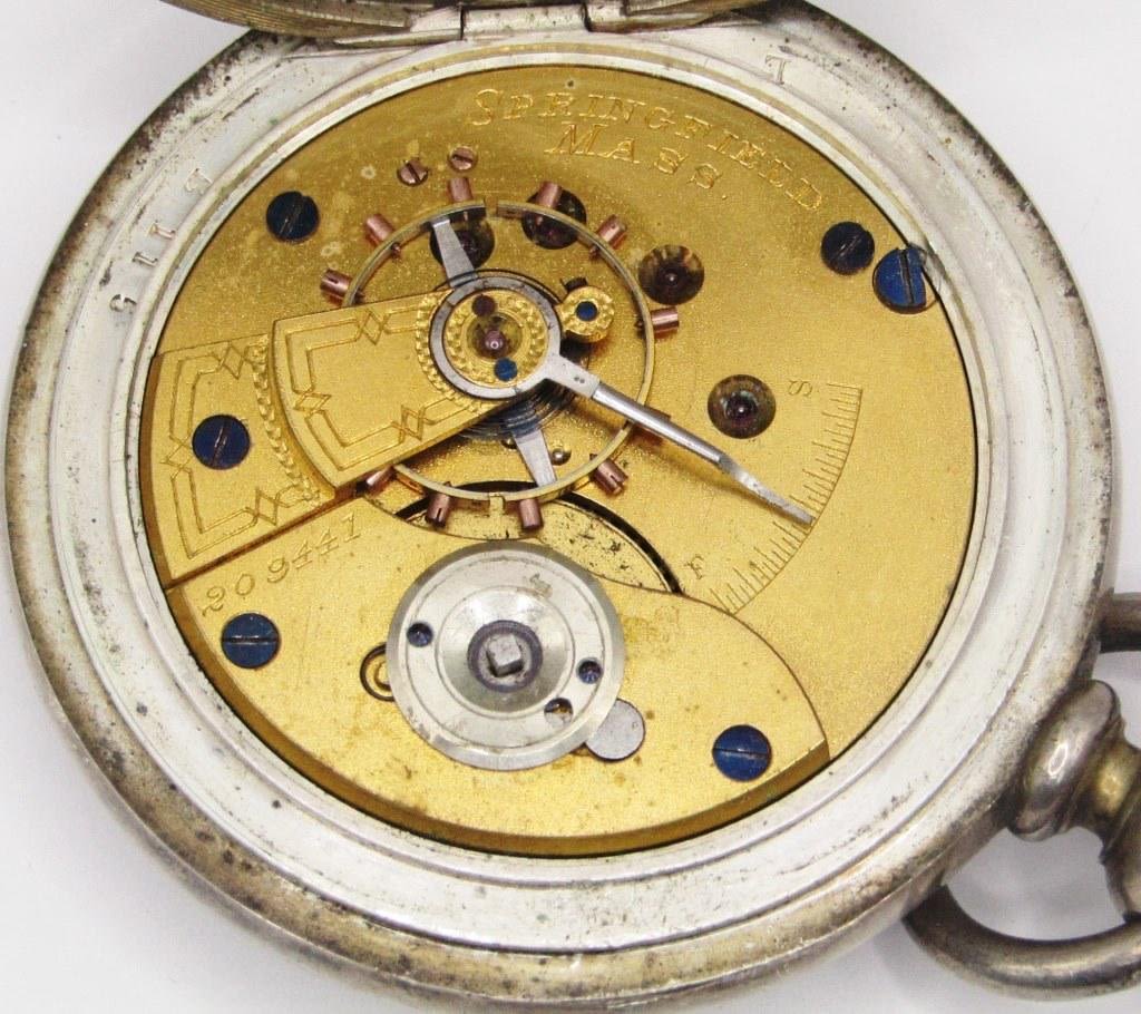 GRADE SPRINGFIELD, 18 SIZE, SERIAL NUMBER 209441, 11 JEWEL, COIN SILVER, NO KEY, NOT RUNNING, FACE HAS NO ISSUES BUT NEEDS CLEANED – BOW has replaced PIN