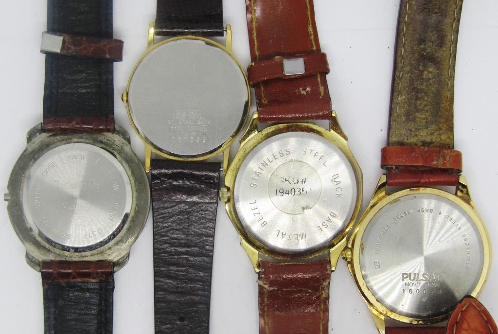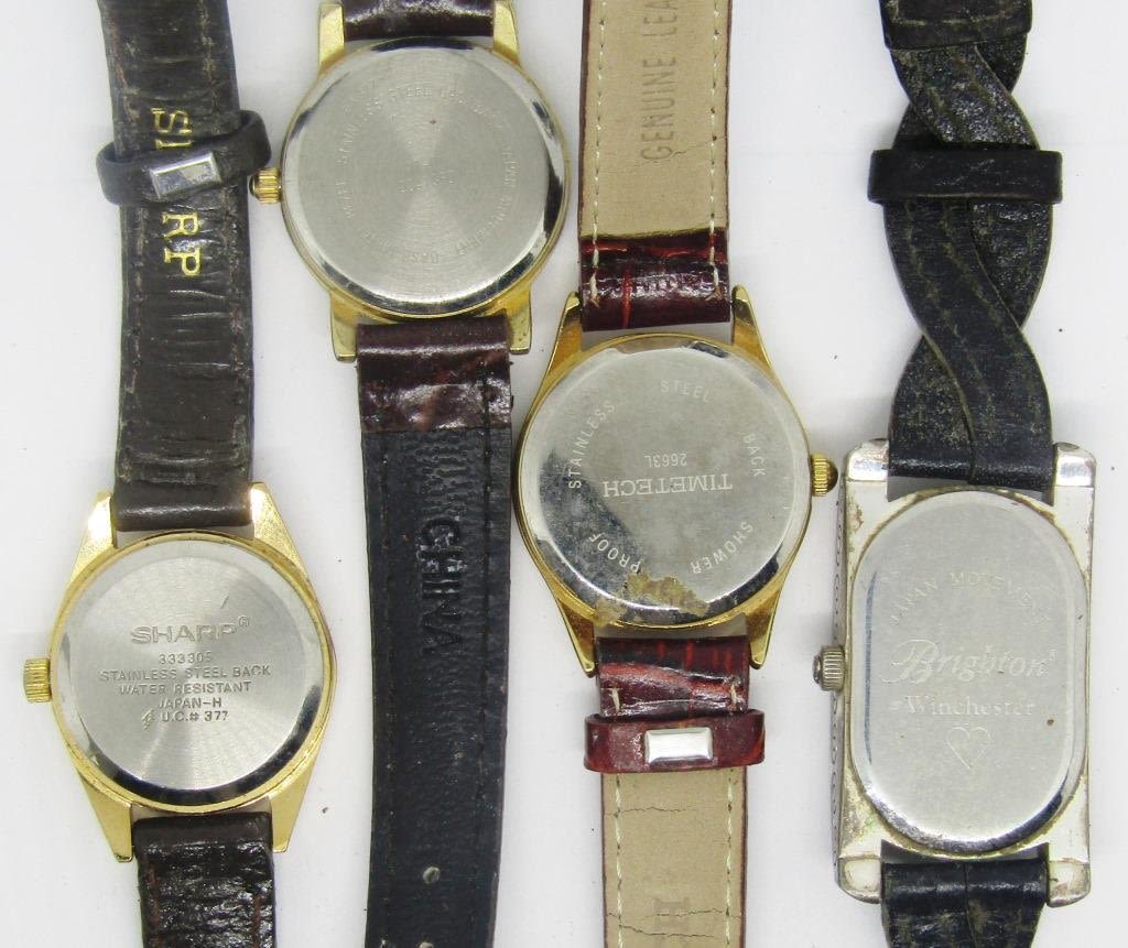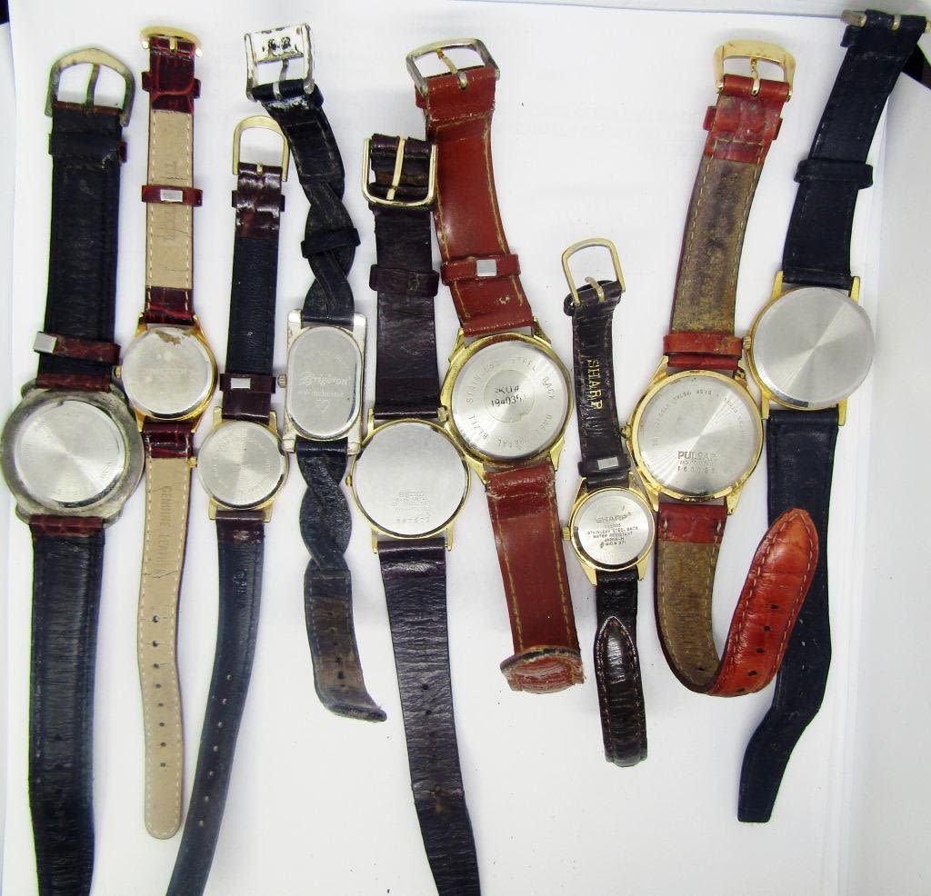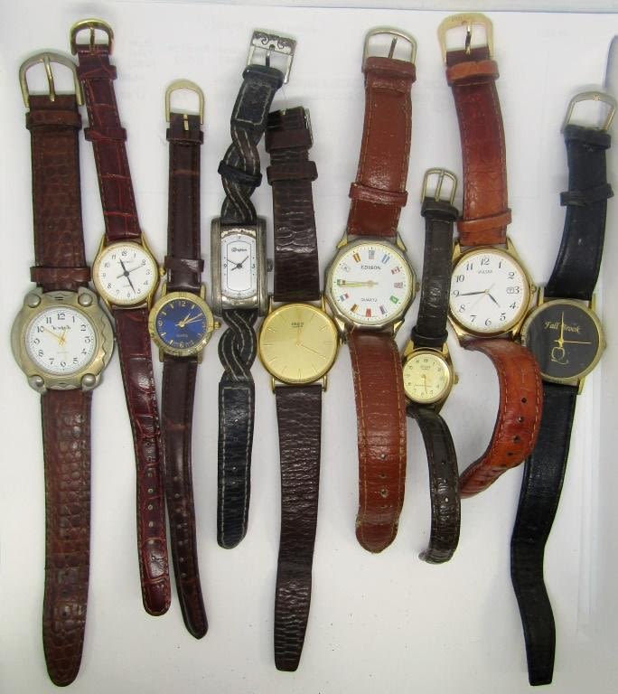 SET OF 9 UNTESTED LADIES WRIST WATCHES W/ LEATHER LIKE BANDS: EDISON, BRIGHTON, LE WATCH BY QUINTEL, FALL BROOK, TIMETECH, SEIKO, SHARP, PULSAR & OTHER.