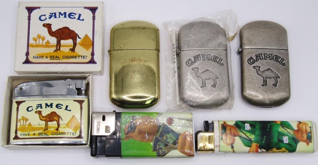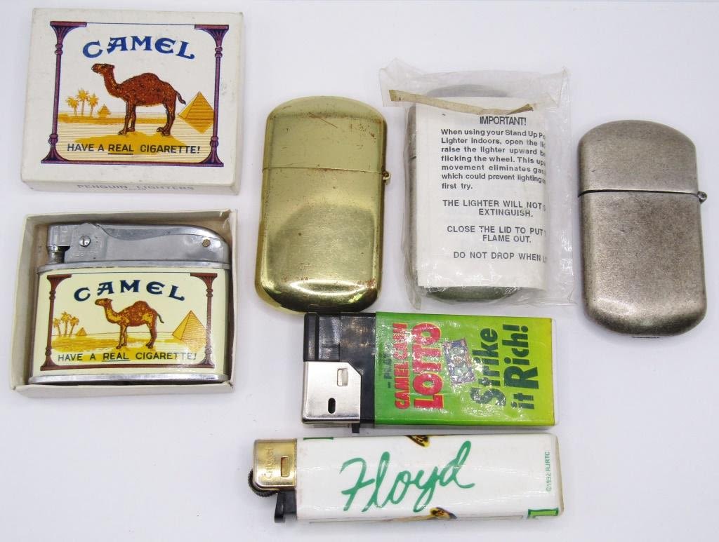 1 Zenith "Have A Real Cigarette" Flat, 3 Flip Tops (1 Silver Toned Unstruck), 1 Camel Cash Lotto, 1 Floyd marked Joe Camel
