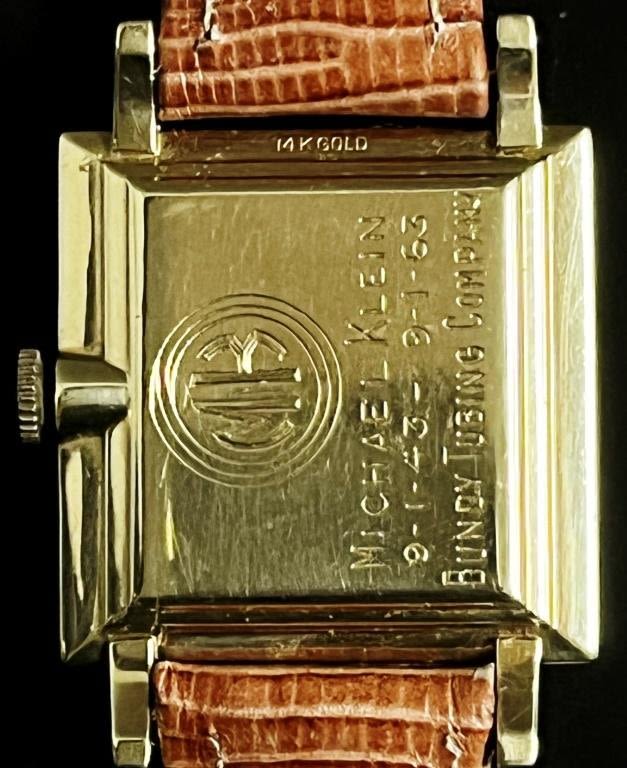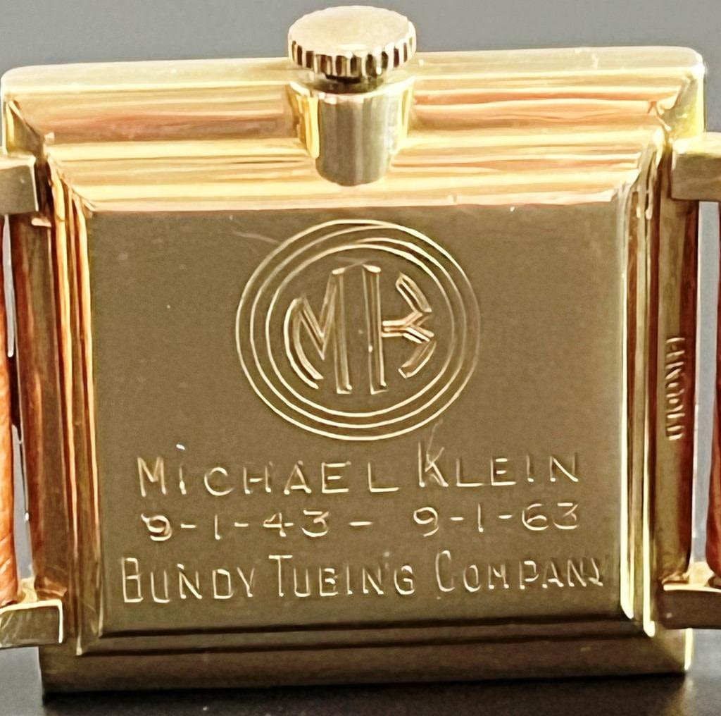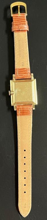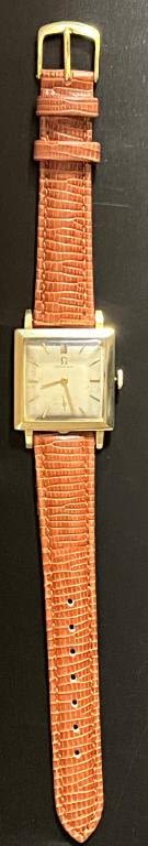 ORIGINAL DIAL, 14kt SNAP TOP CASE, 17j, CAL 302 MOV’T, NEW STRAP, CASE MEASURES APPROX 28mm SQUARE, 1963 CORPORATE PRESENTATION ENGRAVING All Watches in Running Order when catalogued Unless otherwise noted.