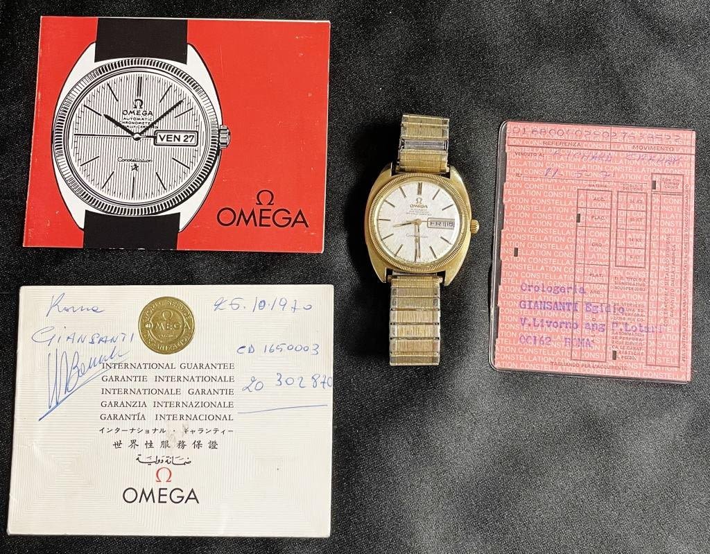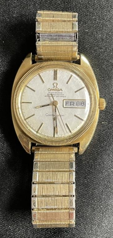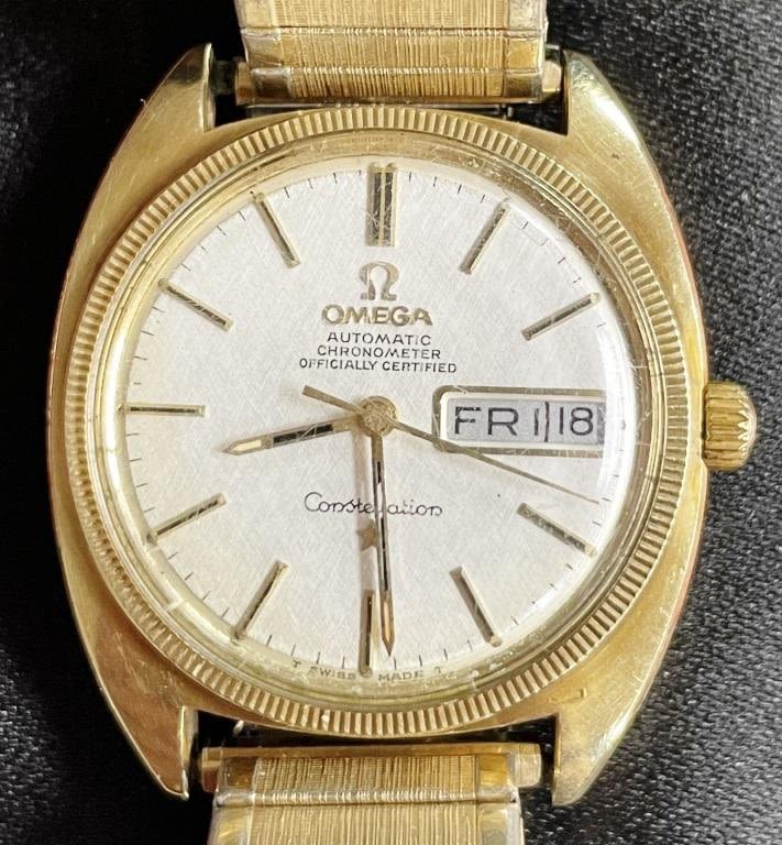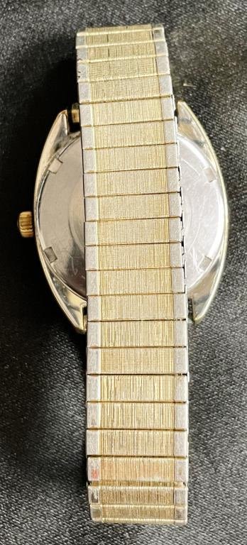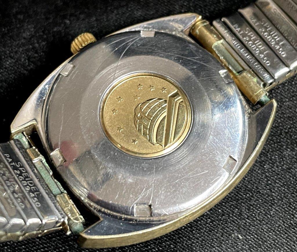 Perfect Linen Dial Original Yellow Gold Capped Case With Steel Screwback Featuring Gold Constellation Logo; 24 Jewel Cal 751 Movement; Vintage Stretch Bracelet; 168.029 Case Reference; Also Included – Warranty Card