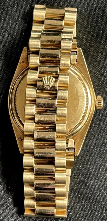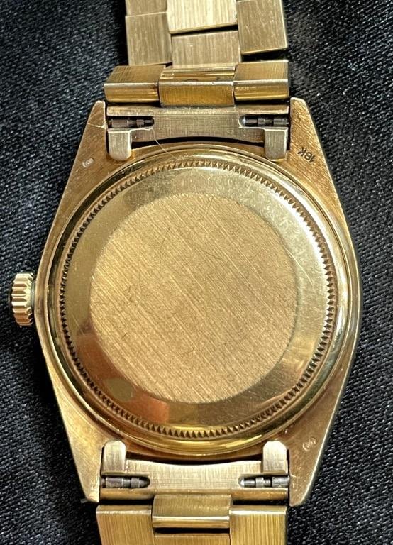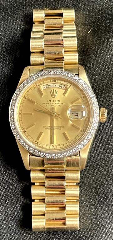 Perfect Champagne Original Dial; Reference 18038 18kt Gold Head and Bracelet; 27 Jewel Cal 3055 Movement AfterMarket Diamond Bezel; Nice Watch!! Serial Number – 5 Million, Bracelet with 2 Extra Links. All Watches in