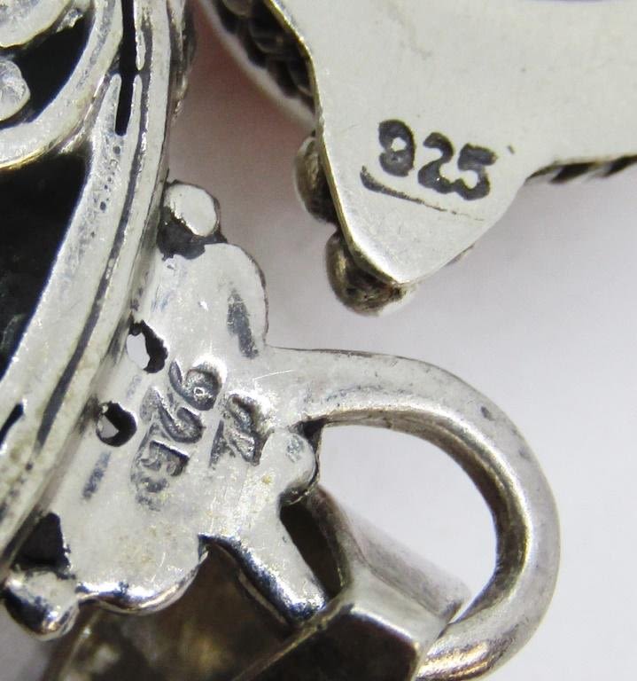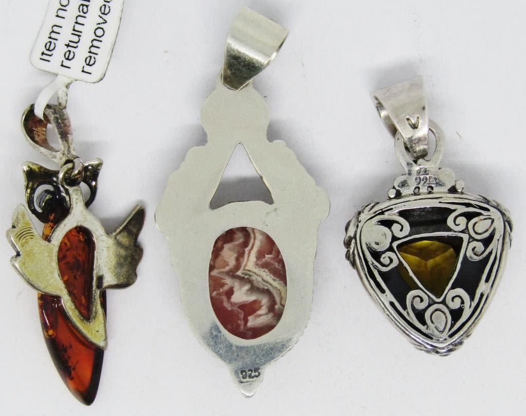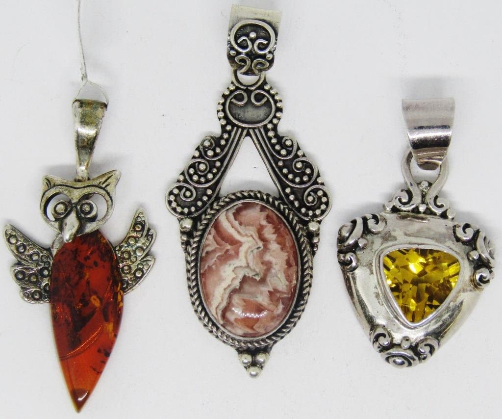 (1)MARCASITE OWL WITH BALTIC AMBER (1)WITH PINK MARBLE CENTER STONE (1)TRIANGLE WITH YELLOW CENTER STONE-TOTAL 13 DWT